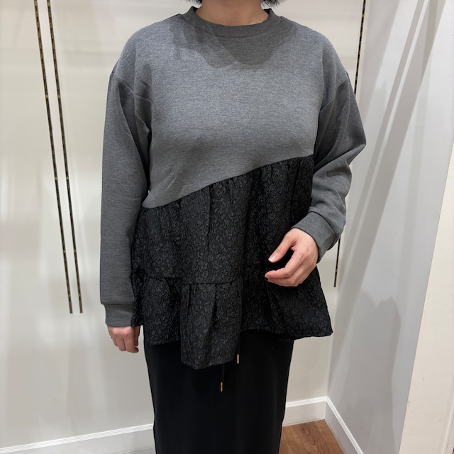 柔らかいモチモチとした段ボール素材×ジャガードの生地をドッキングさせたフェミニンなプルオーバー。 裾を膨れジャガード素材で切り替えドッキングした、一枚で華やかなトップスです。 身頃の上部分はストレッチの効いた生地で脱ぎ着も楽ちん◎。 ゆったりとしたシルエットと気負いなく取り入れられるしっかり丈で、気になるヒップラインも自然にカバーしてくれます。 しっかりと丈があるので、Iラインスカートやテーパードパンツなど細身のボトムがお好きな方にオススメのトップスです。 ⚫︎品番 7551002 ESPEYRAC ⚫︎素材 本体 ポリエステル 75% レーヨン 18% ポリウレタン 7% 別布 ポリエステル 100% ⚫︎サイズ 天幅 20cm ゆき丈 68cm 身幅 50.5cm 総丈 65cm ⚫︎モデル身長 165cm 【ご注文前にご一読くださいませ】 ⚫︎在庫について 実店舗でも同時に販売致しておりますので、ご注文と入れ違いで店頭にて完売となる場合がございます。 在庫切れなどの場合は、メールにてご連絡させて頂きます。 ⚫︎店頭と同時販売致しておりますので、店頭にてご試着の場合がございます。 予めご了承の程宜しくお願い致します。 ⚫︎返品交換は承っておりません。 サイズ、カラー等事前にご確認の上、ご購入をお願い致します。 ご不明な点がございましたら、お気軽にお問い合わせくださいませ。 ⚫︎店舗での撮影により実際のお色味と異なる場合がございます。 予めご了承の程宜しくお願い致します。
