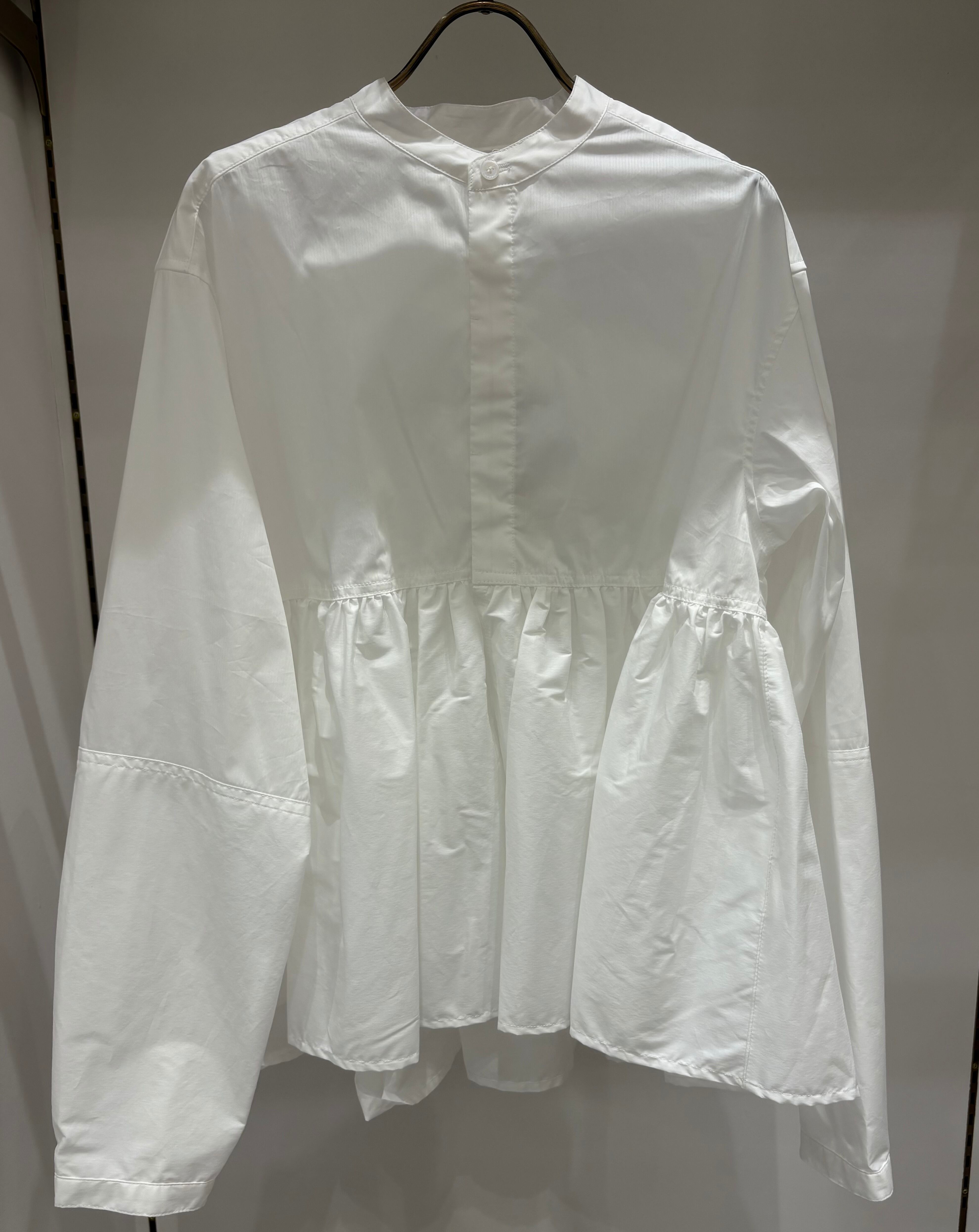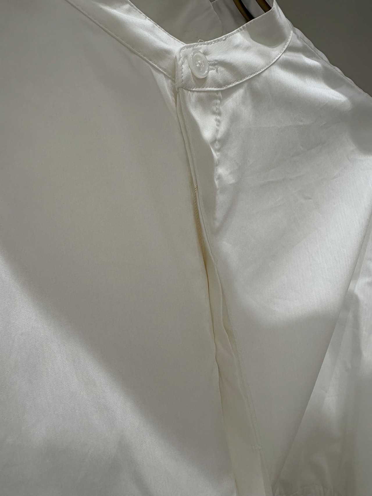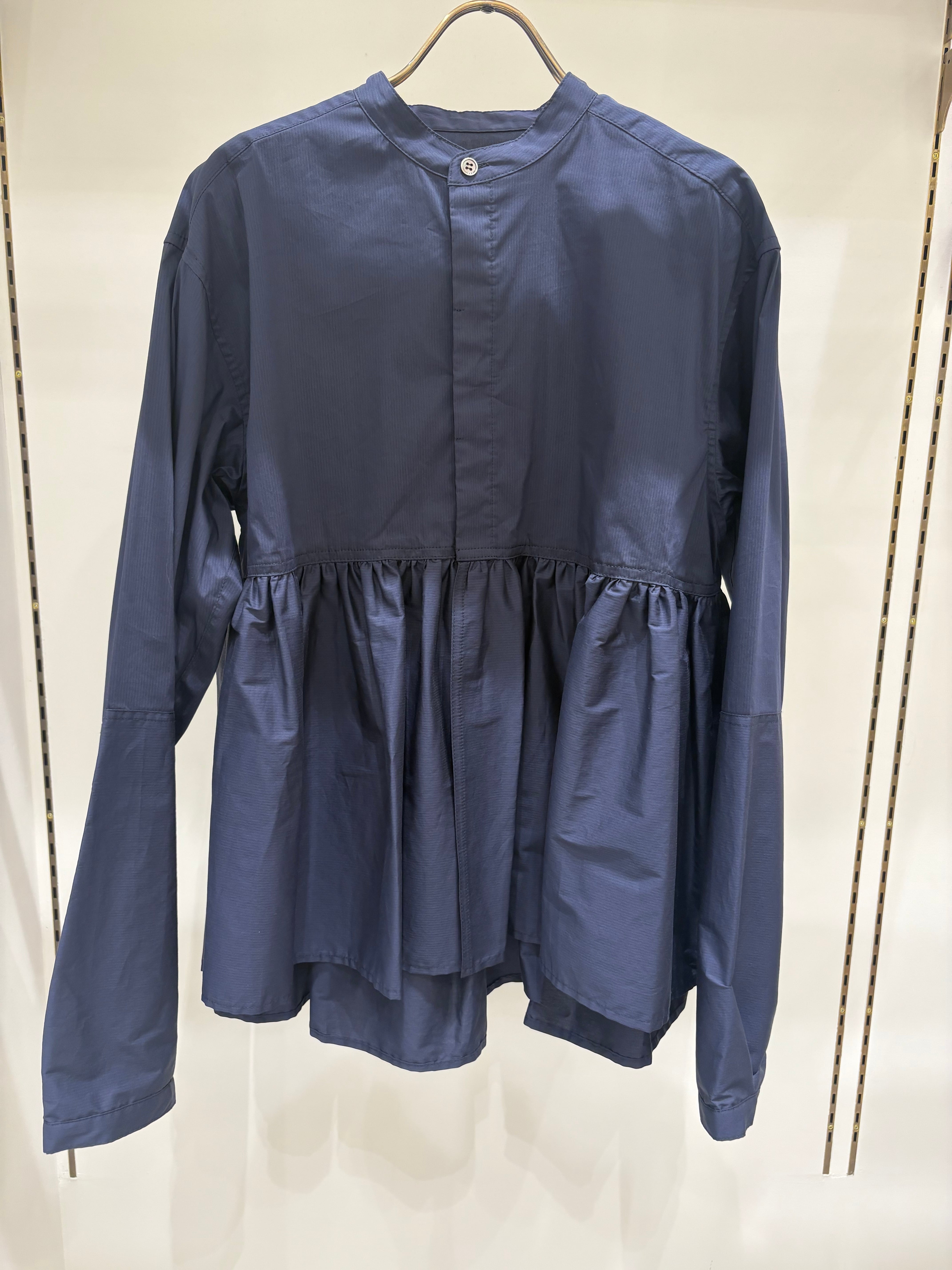 ほのかに浮かび上がるストライプ柄スタンドカラーシャツ。