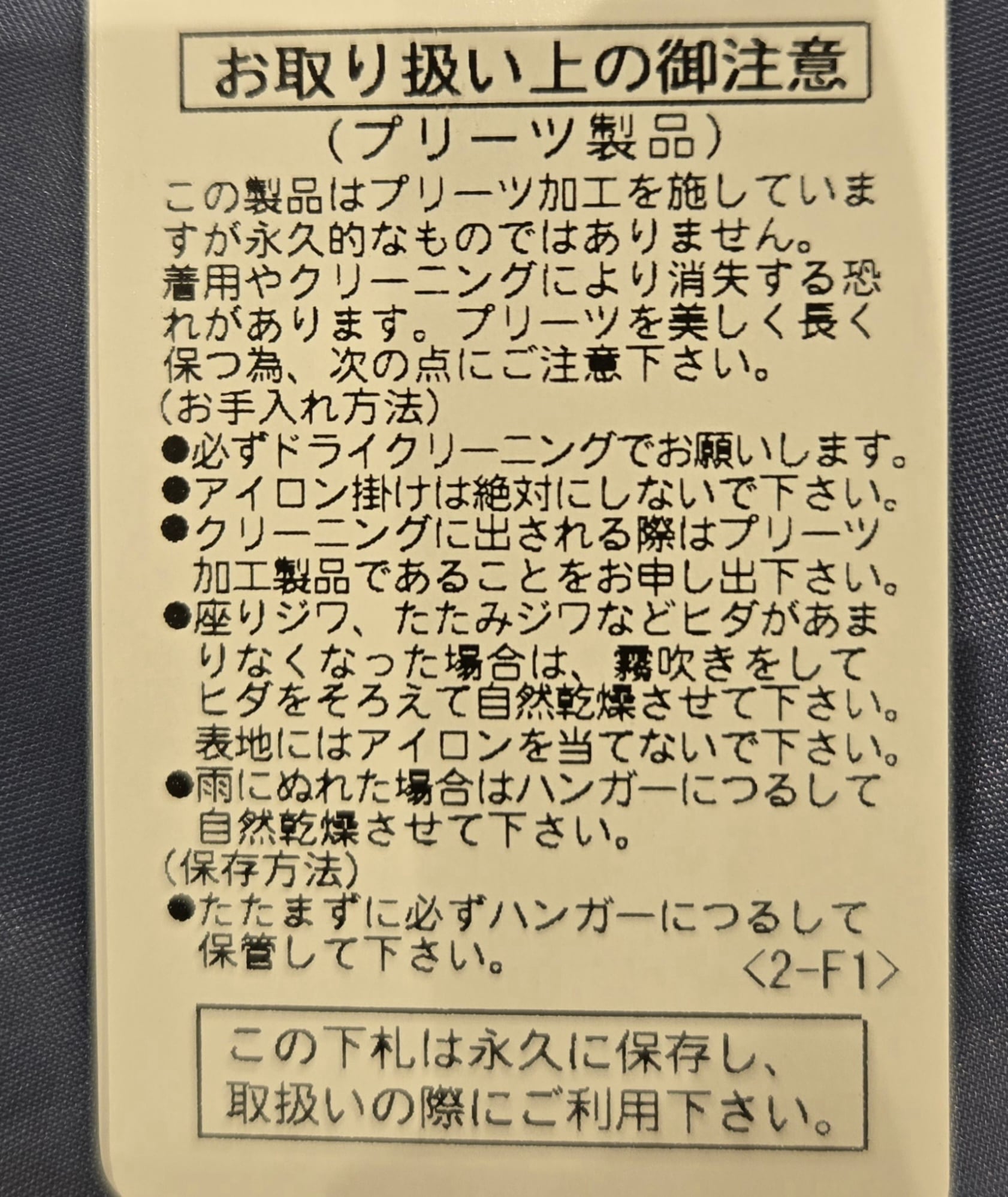 プリーツが作り出す立体感と、しっかりとしたポリエステル素材でシーンを選ばず活躍する1着です。