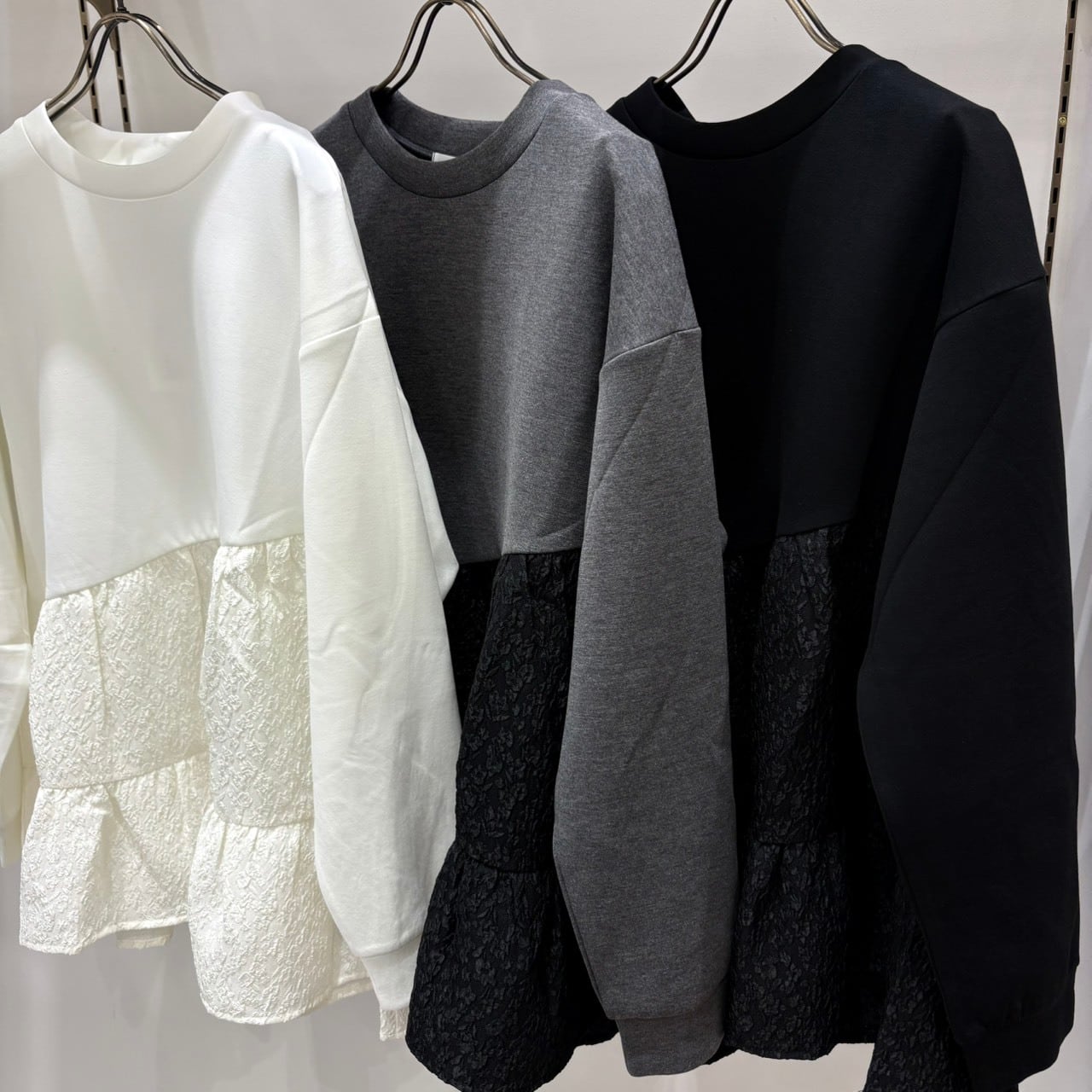 柔らかいモチモチとした段ボール素材×ジャガードの生地をドッキングさせたフェミニンなプルオーバー。