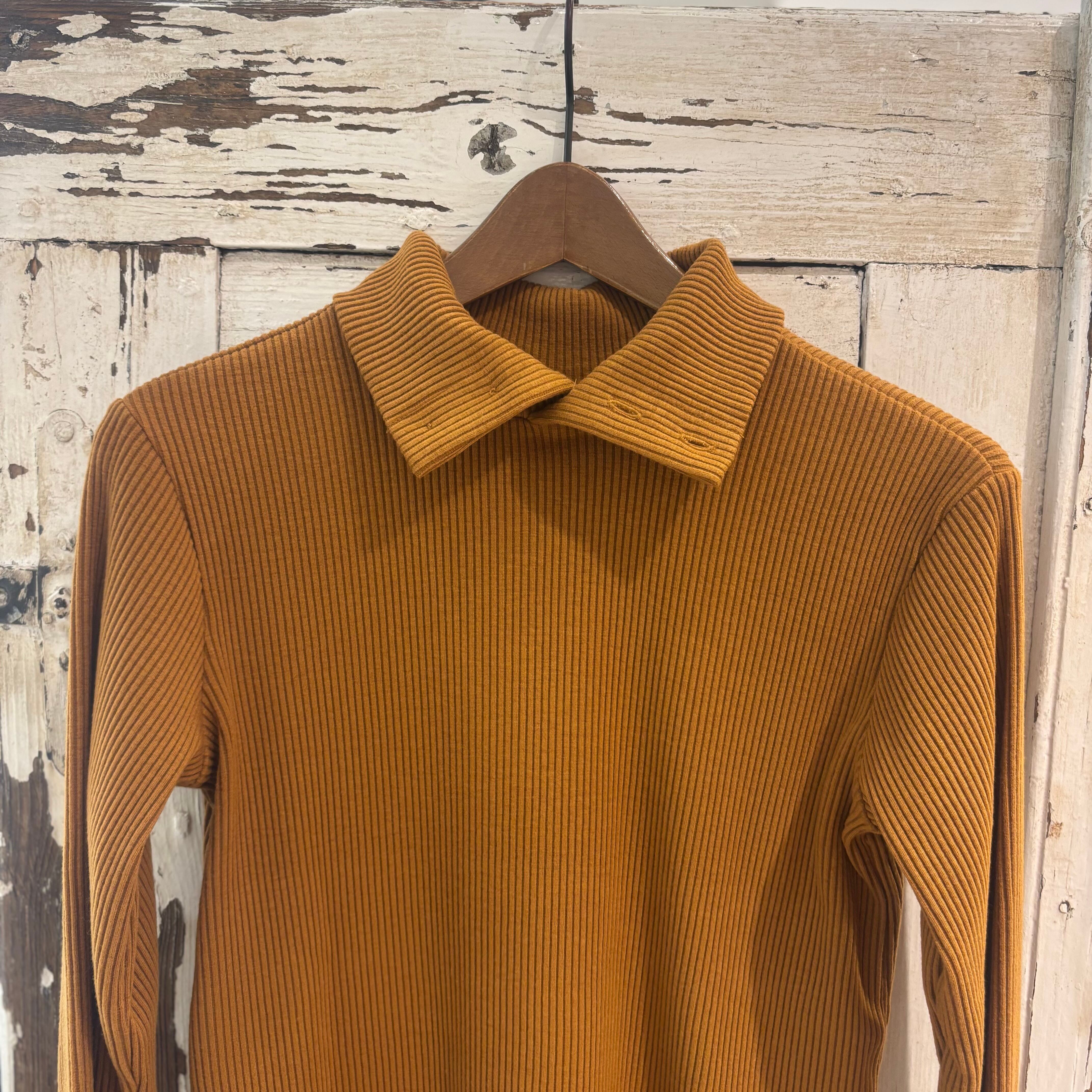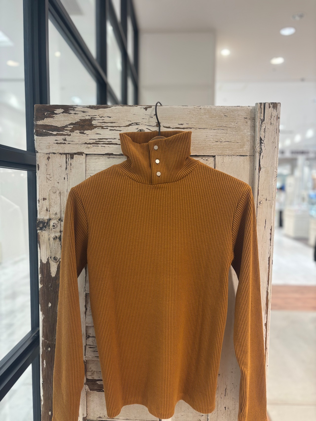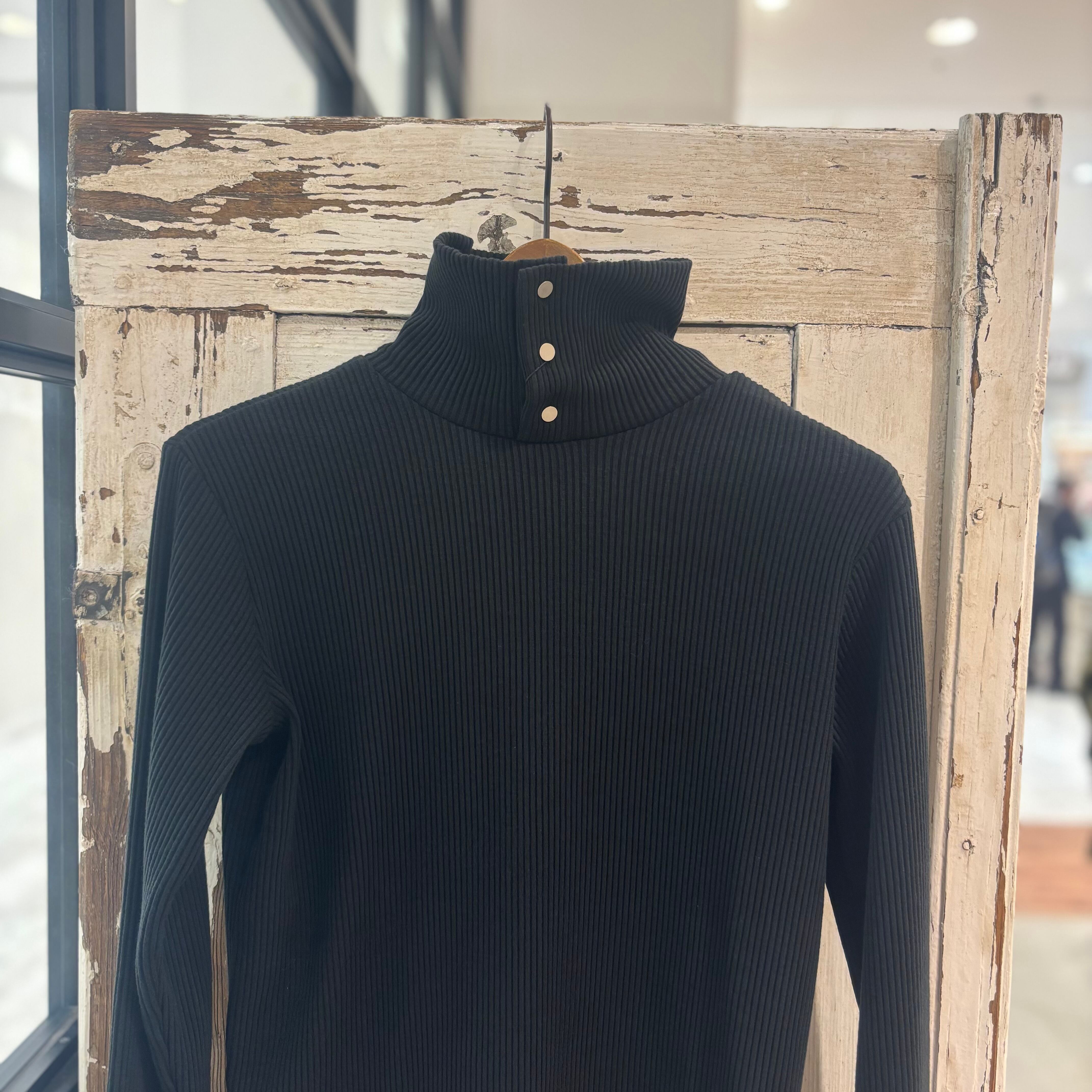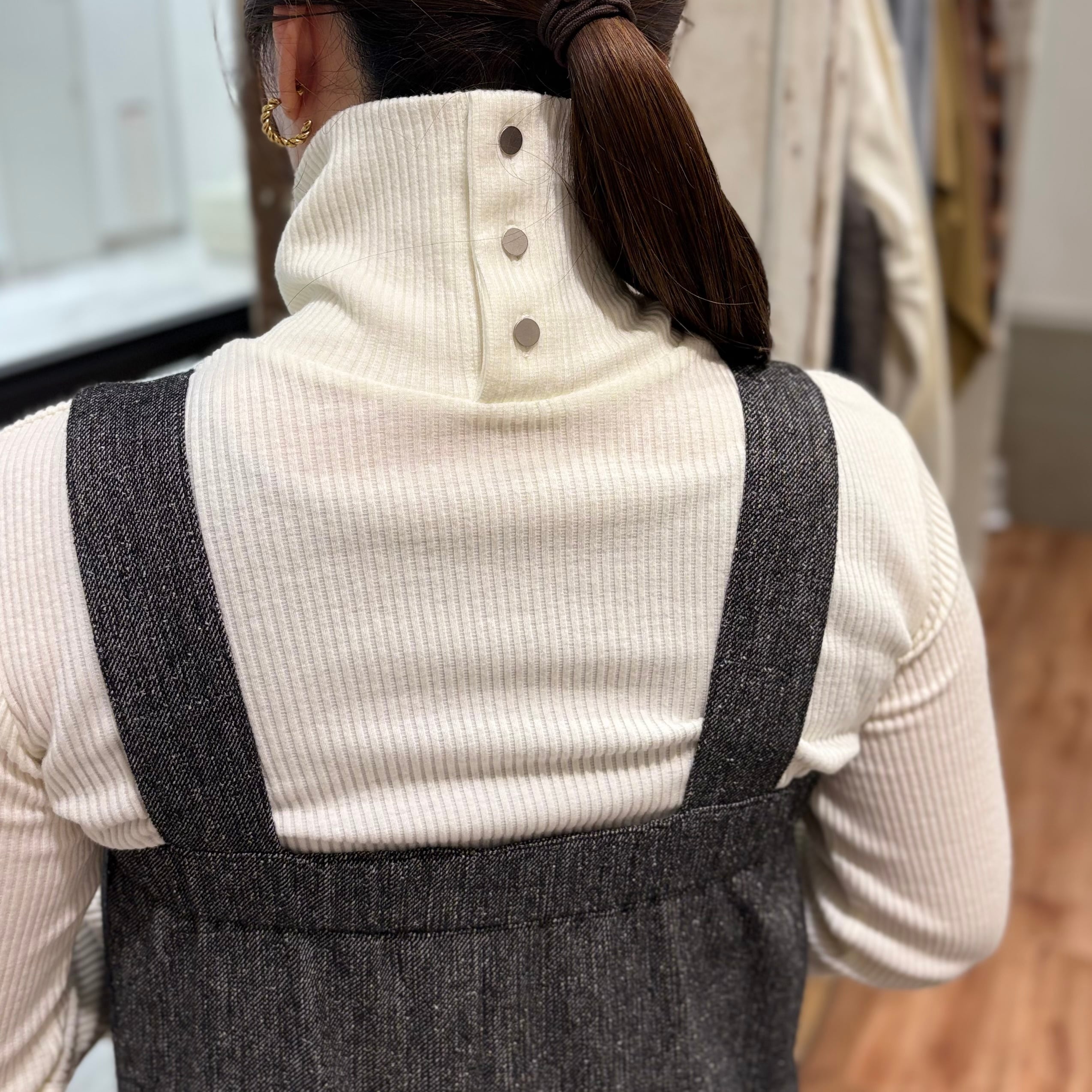 ハイネックの部分は、そのままでも、折っても、ボタンを開けて襟のようにしても着ていただけます!