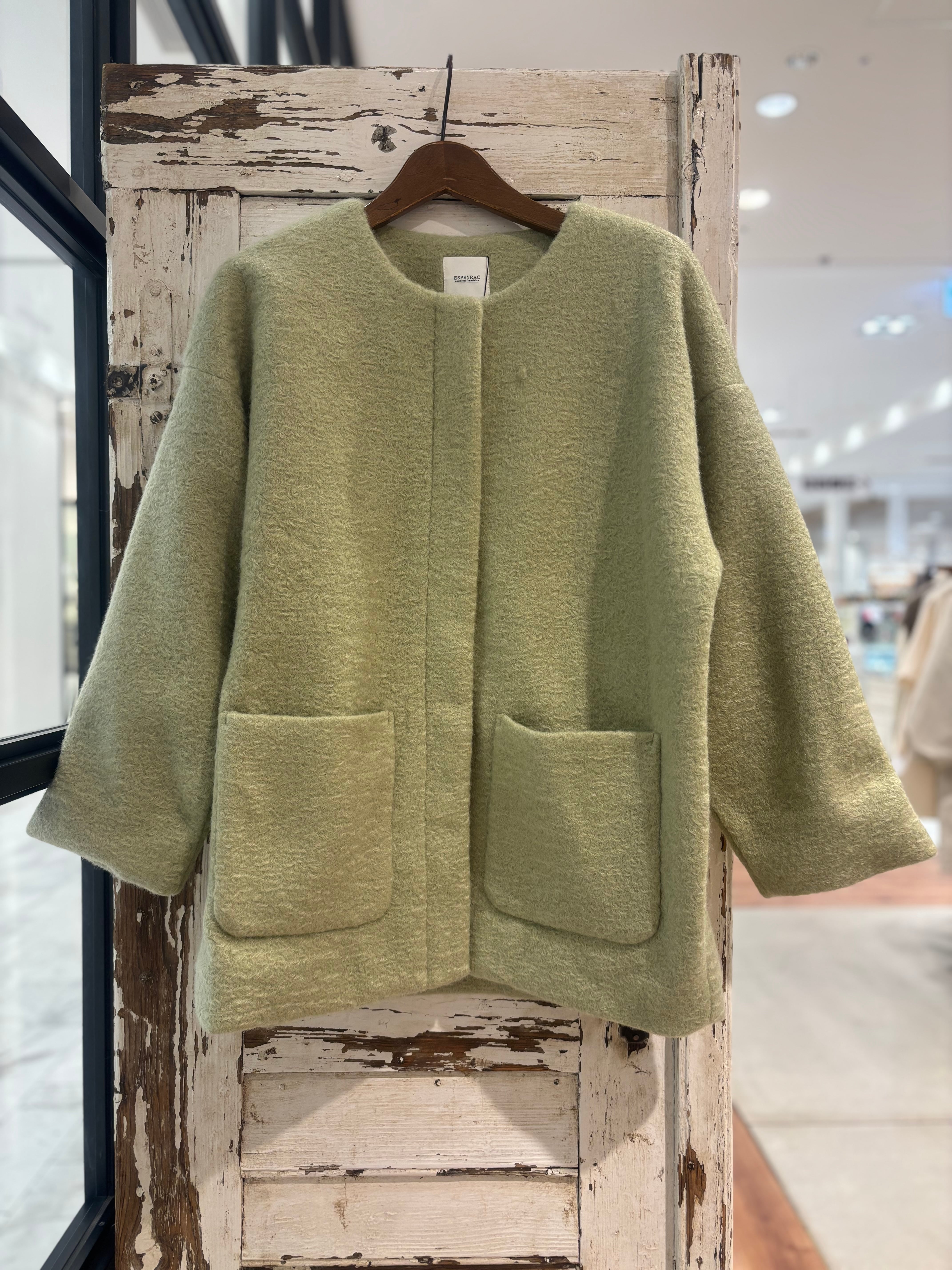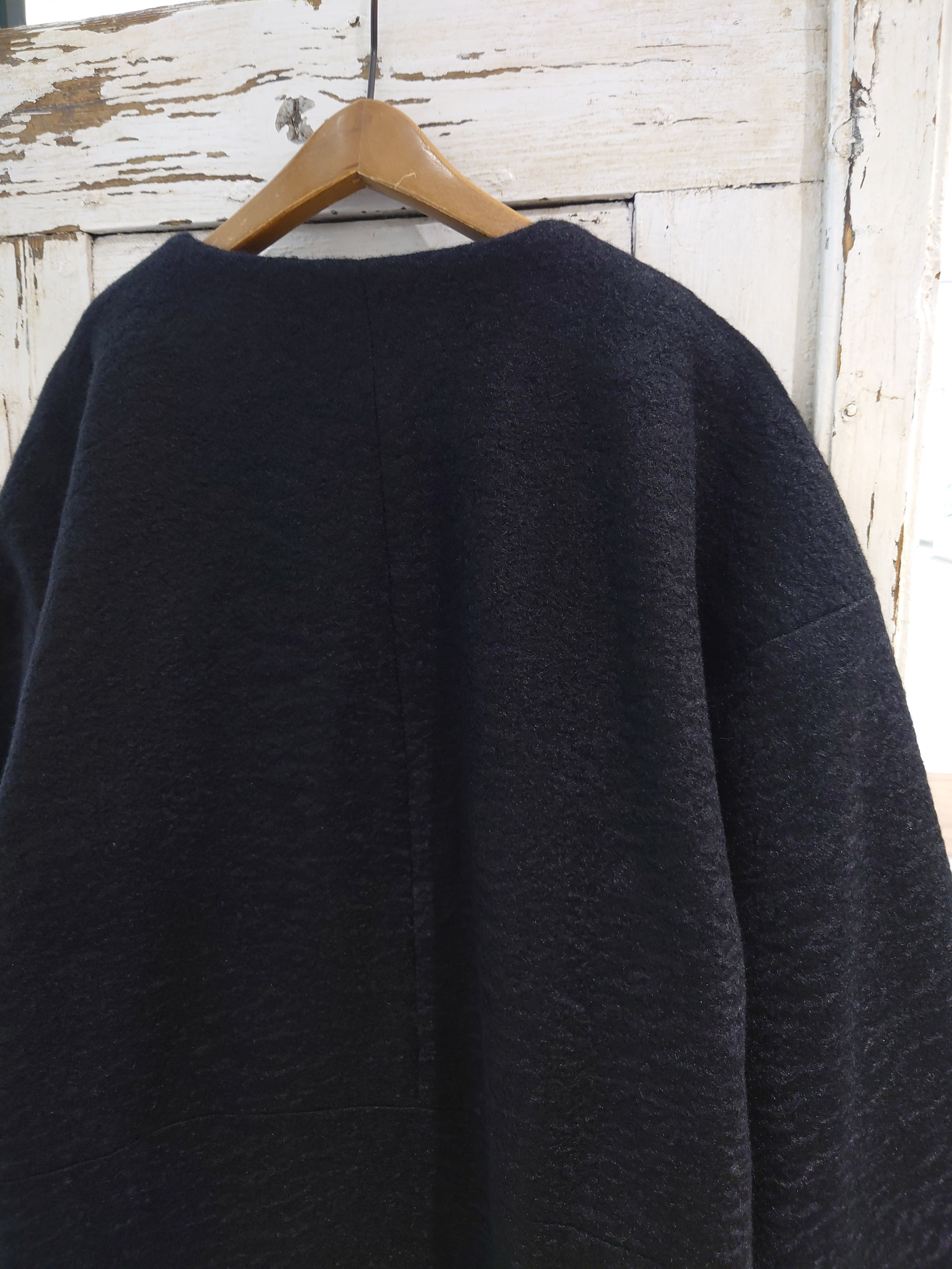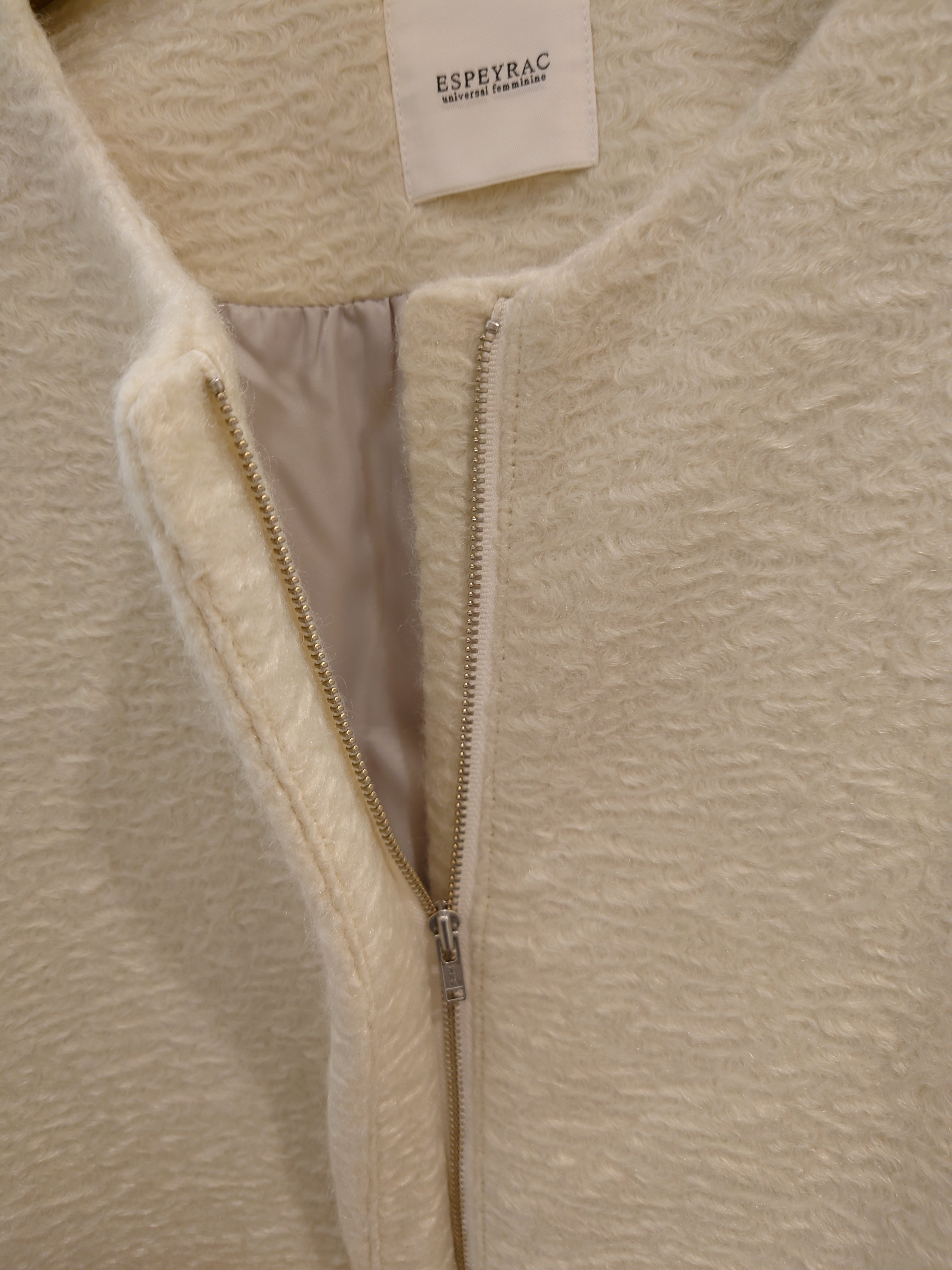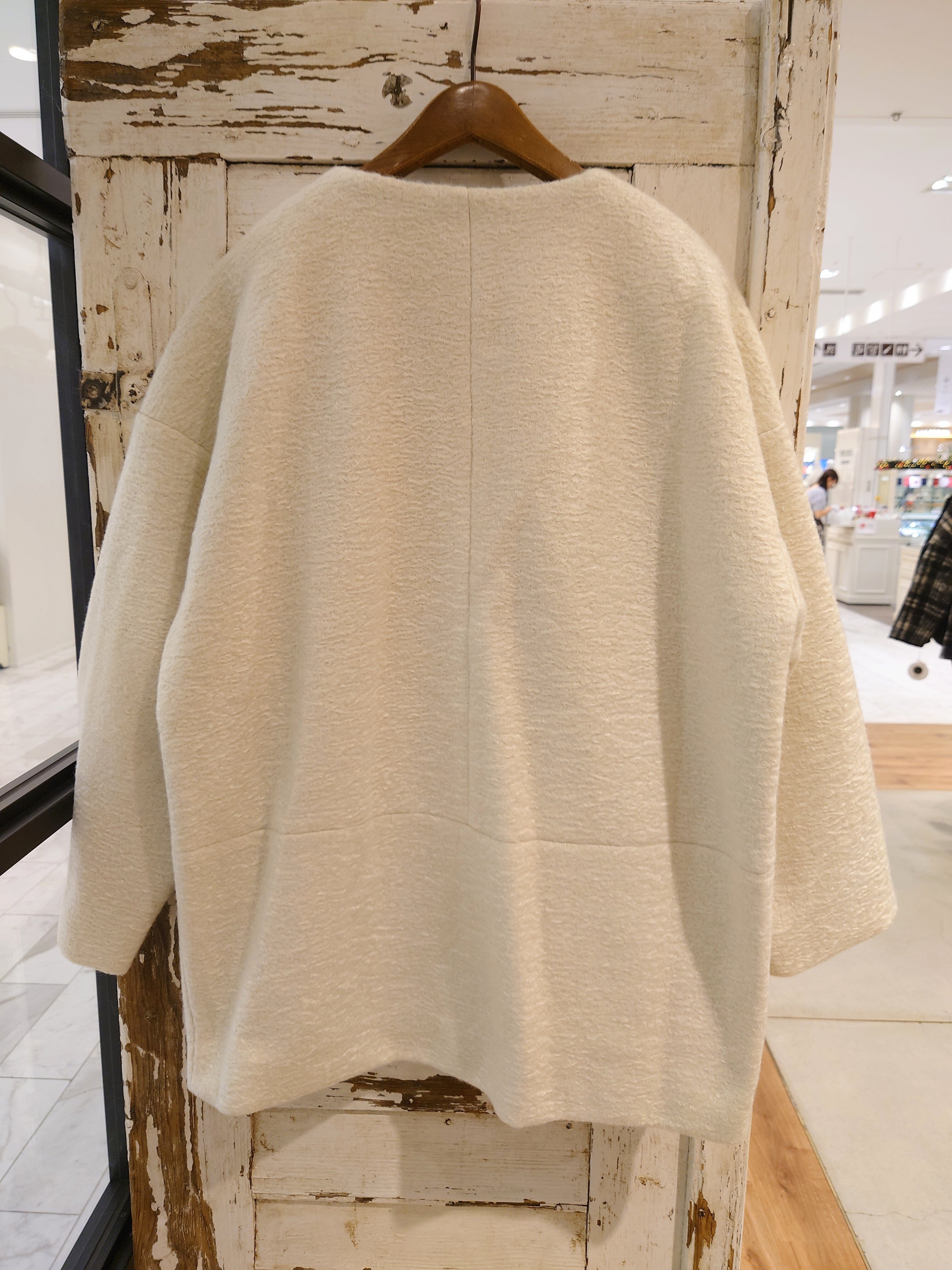 毛足は短めですが少しカールした表面が特徴的な生地を使用したノーカラーコート。