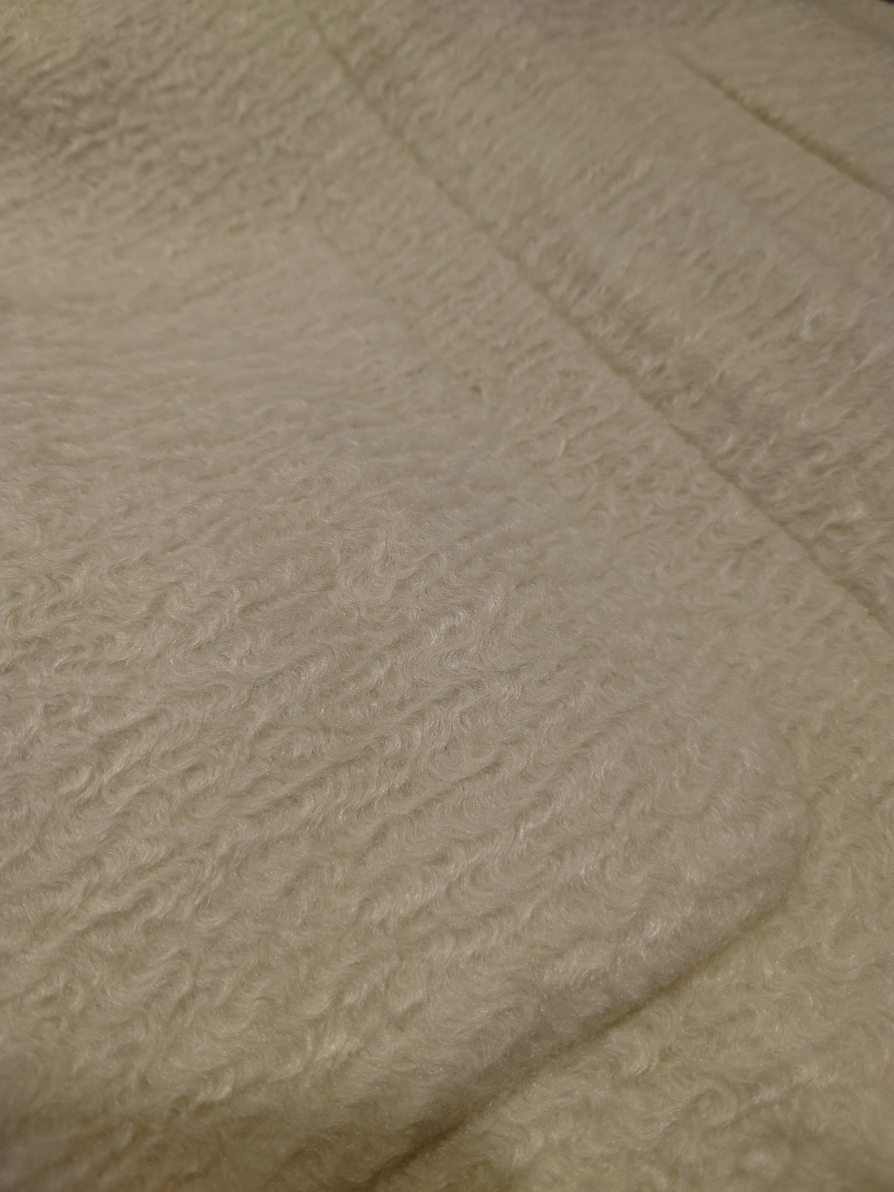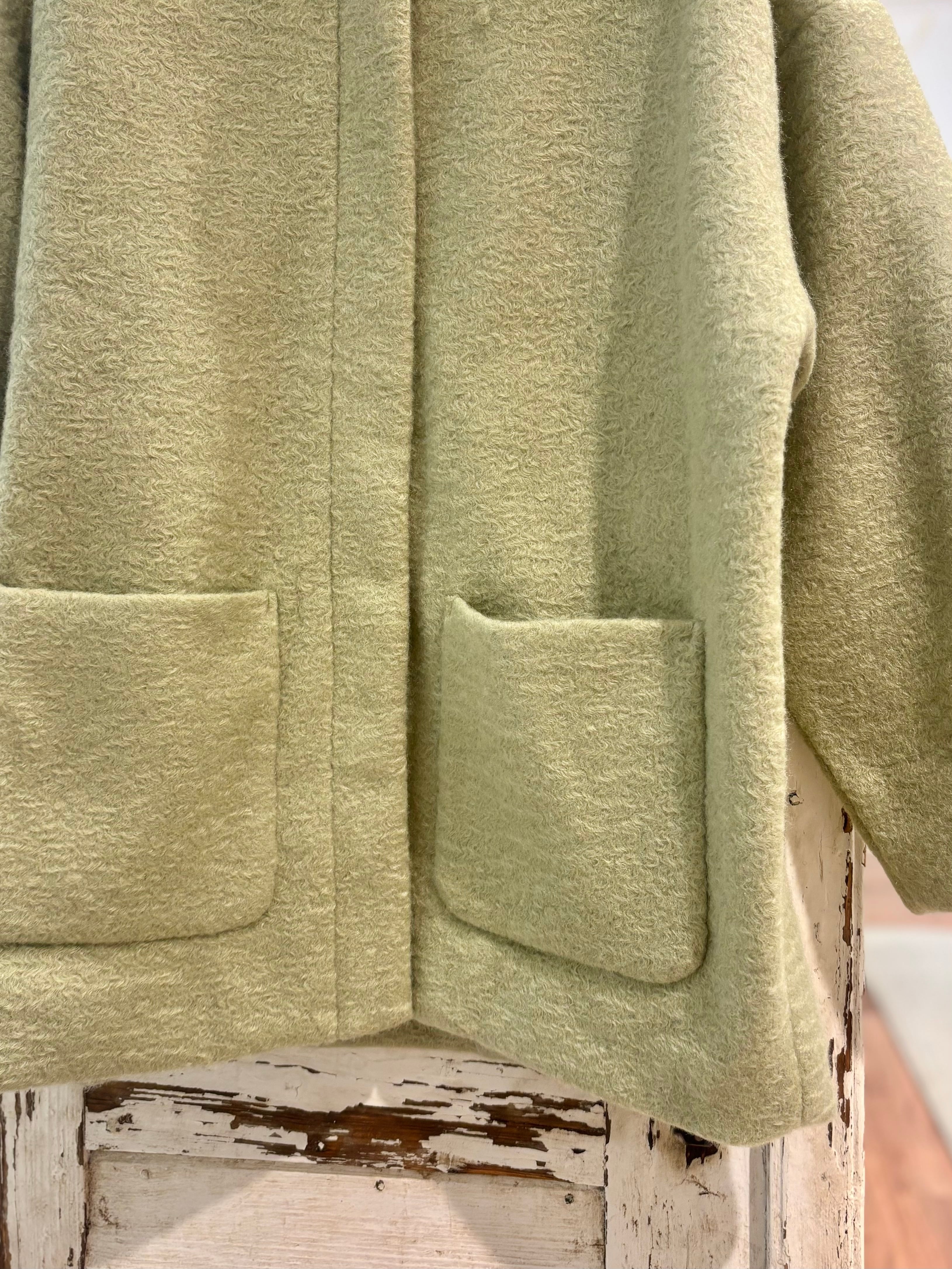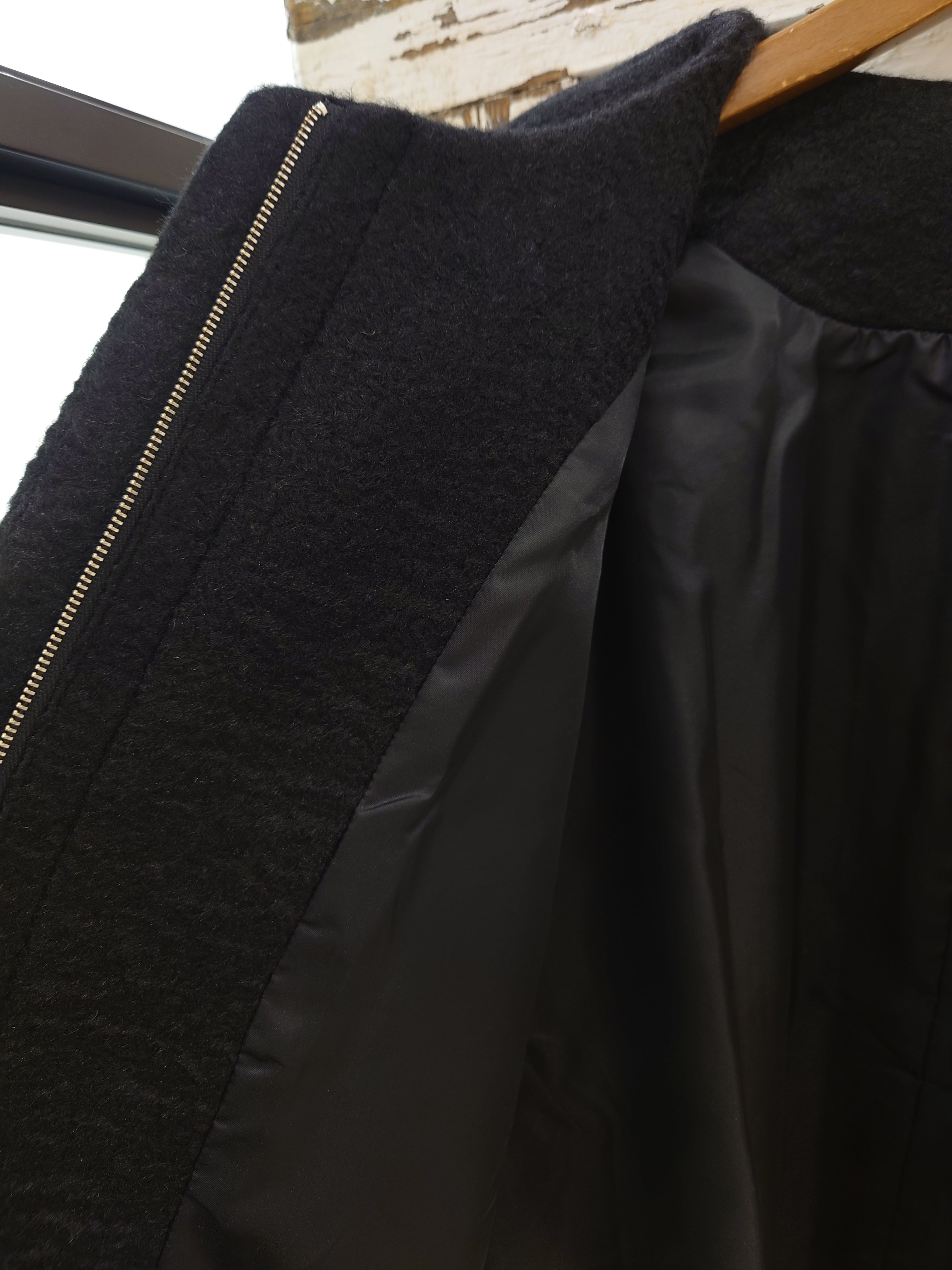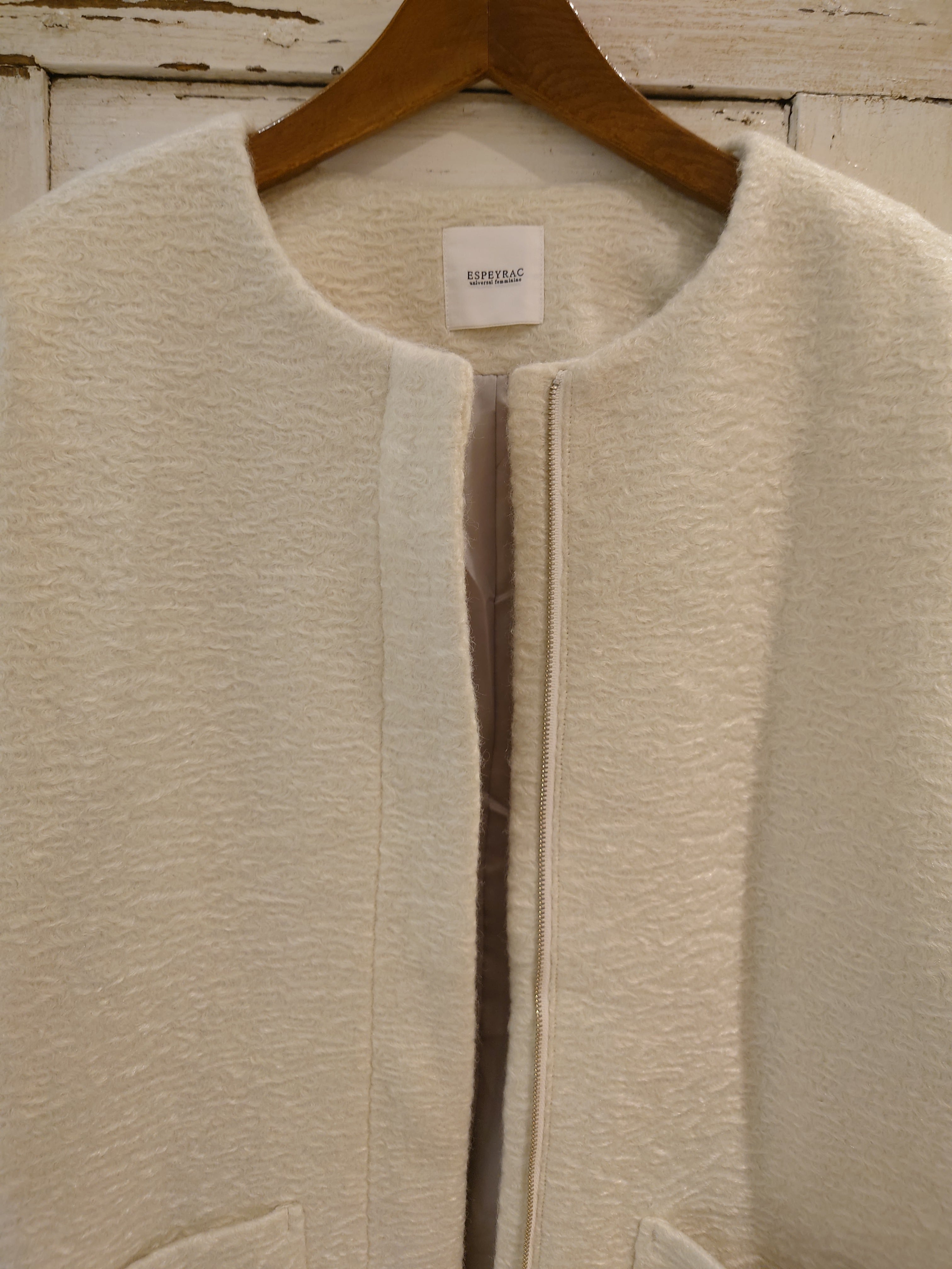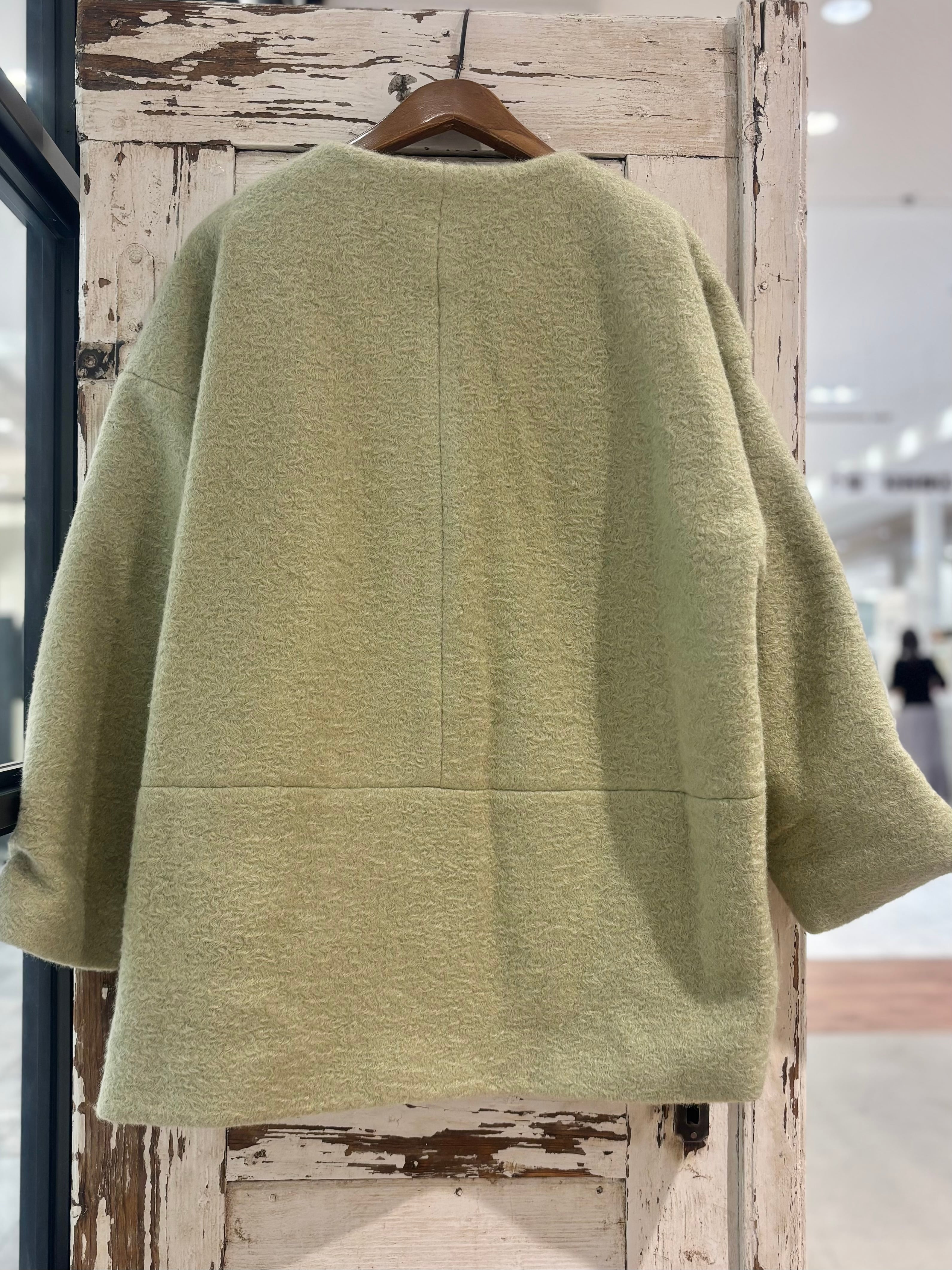 毛足は短めですが少しカールした表面が特徴的な生地を使用したノーカラーコート。