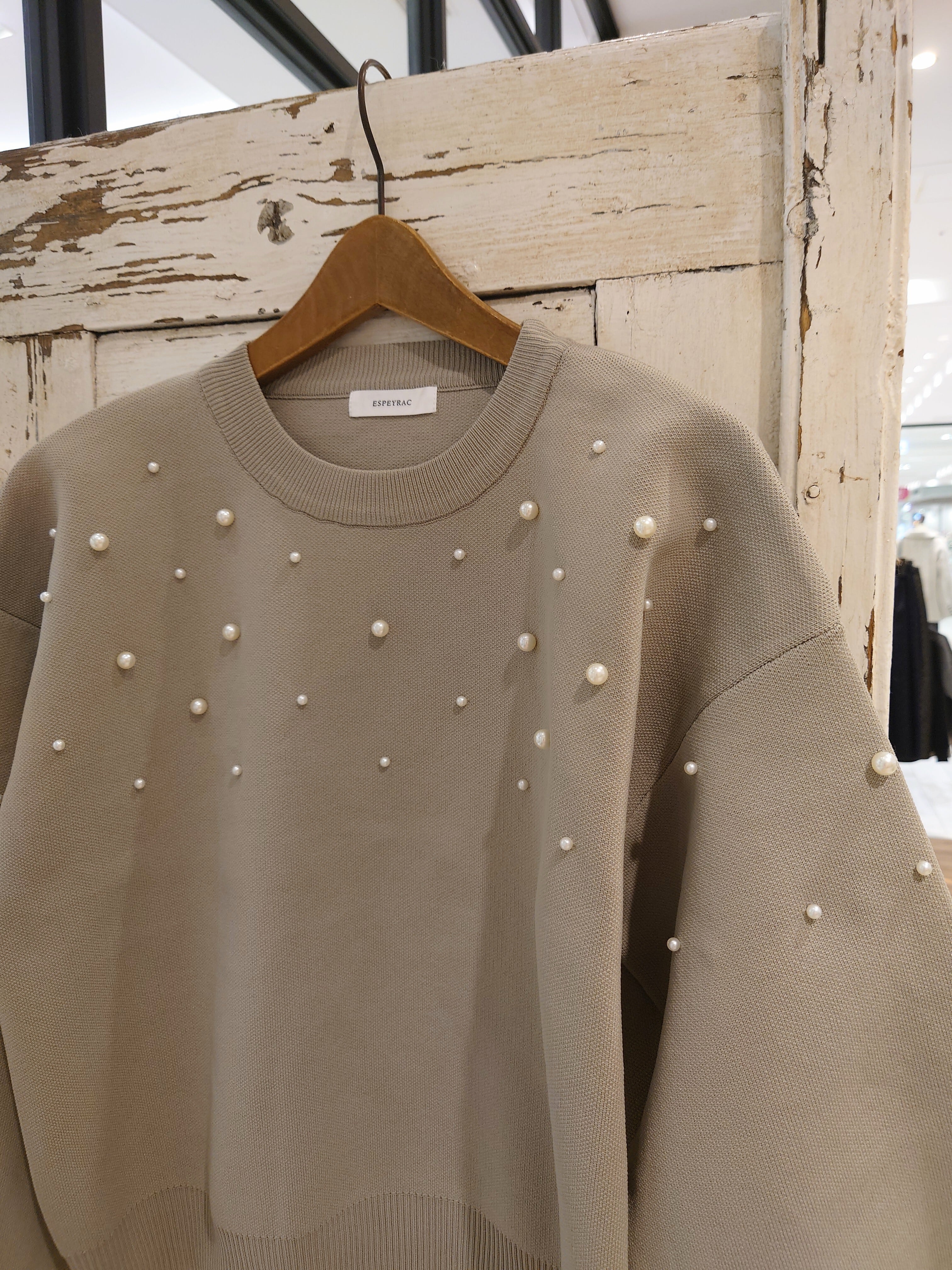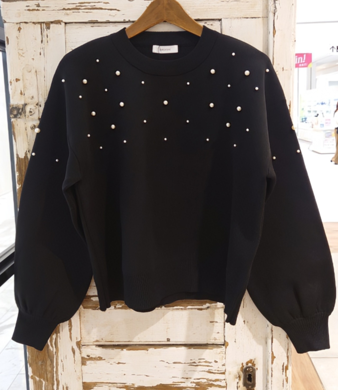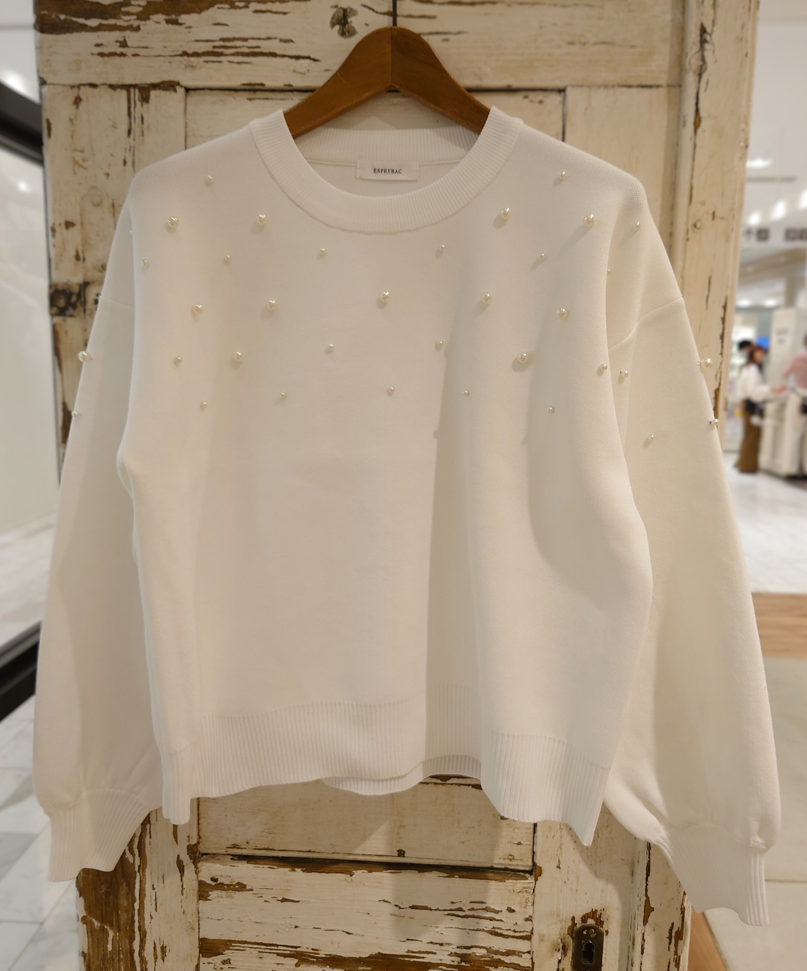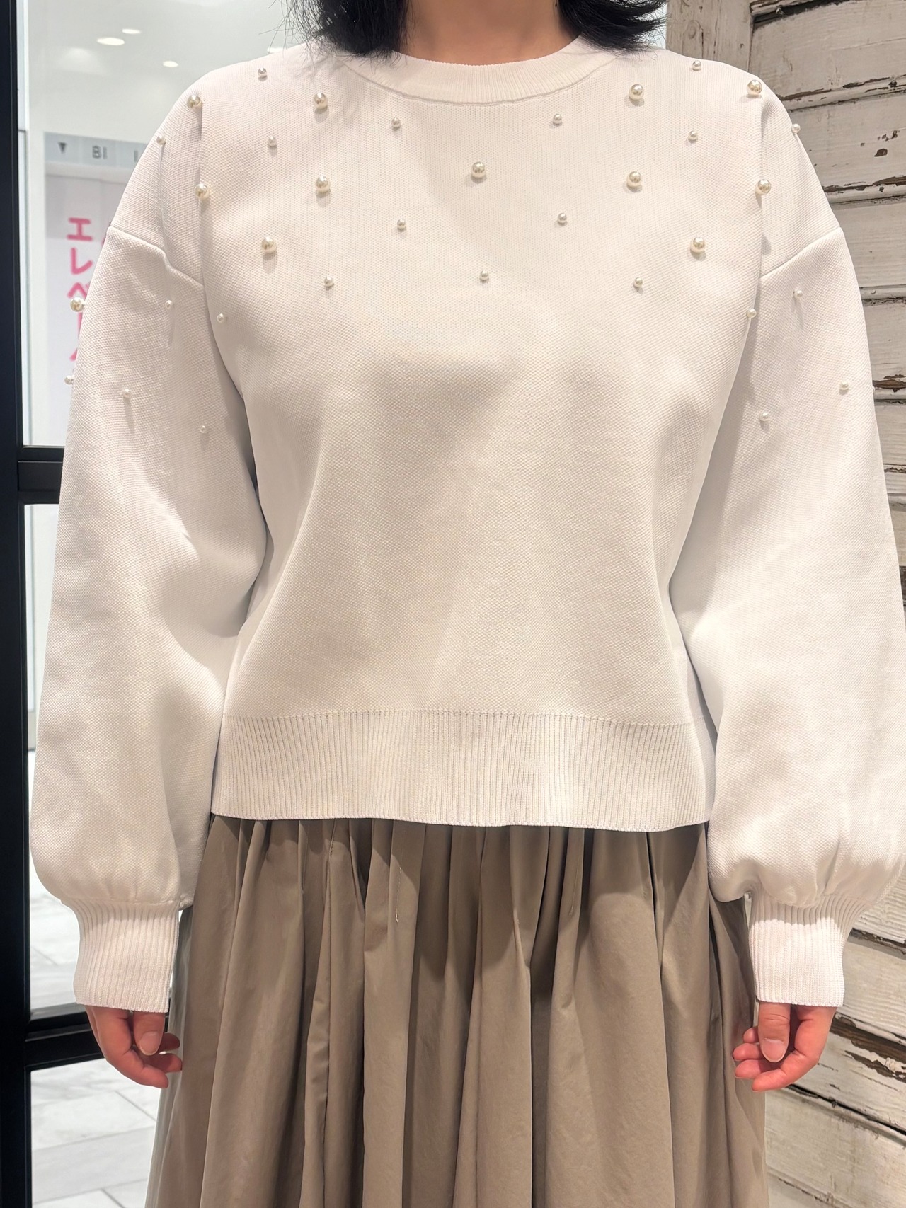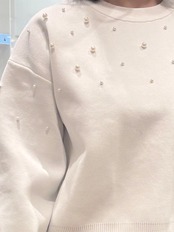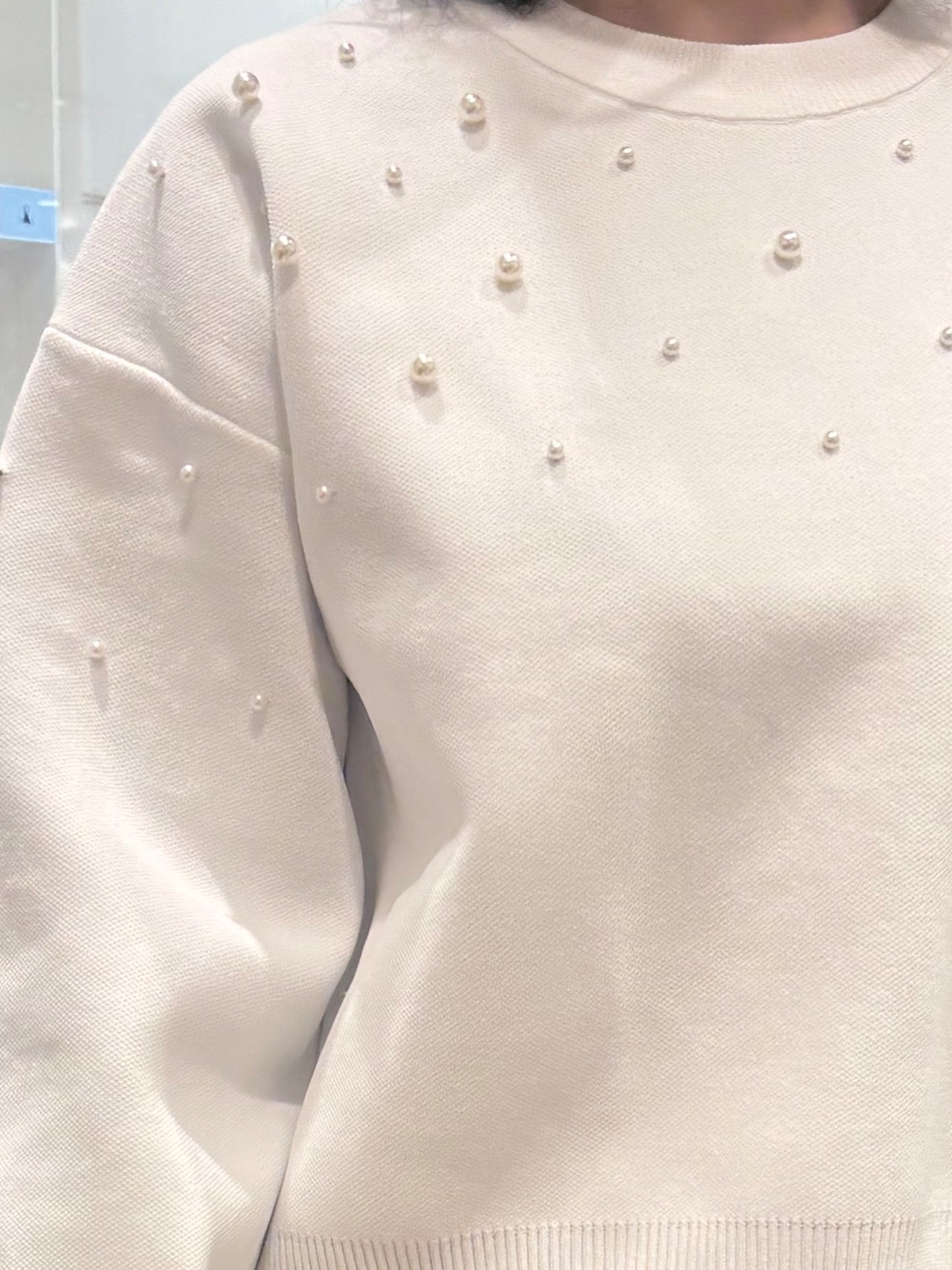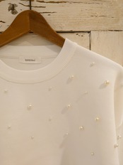 天竺ジャガード生地に光沢のある大小のパールが散りばめられたニット。