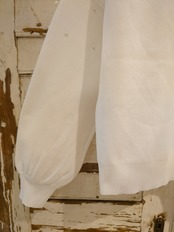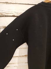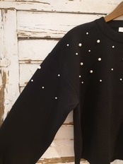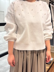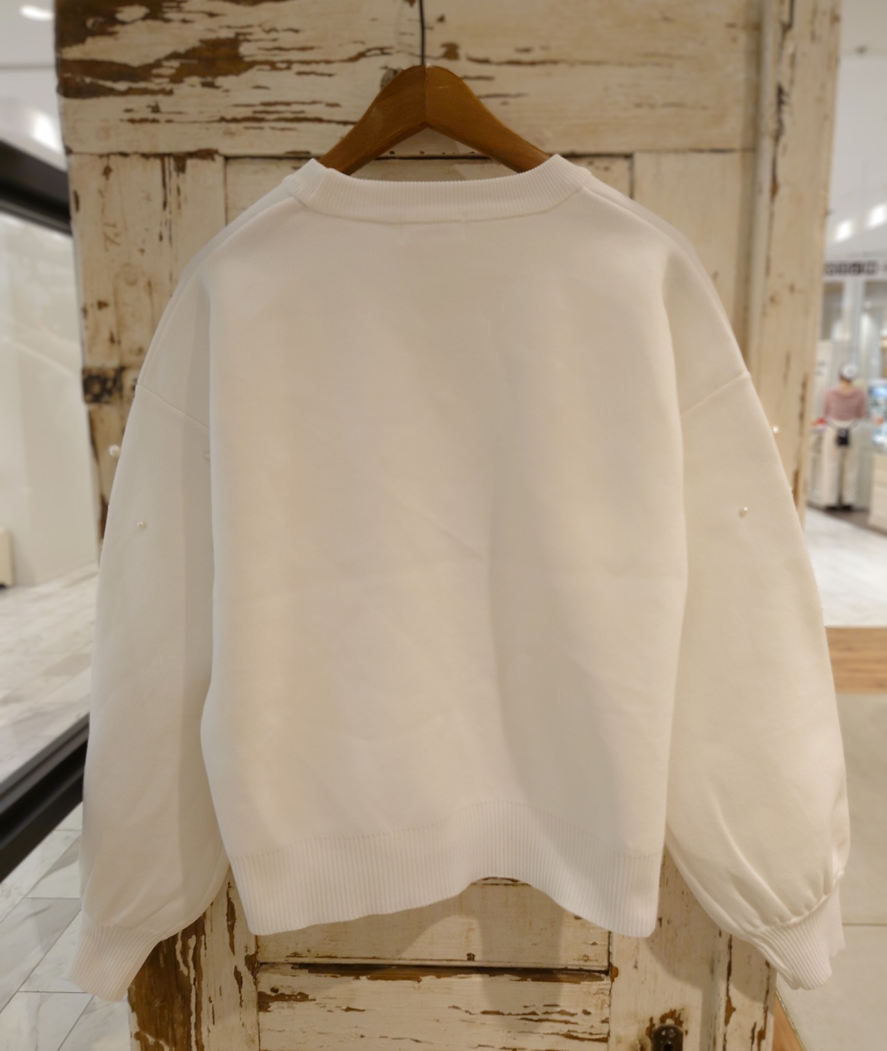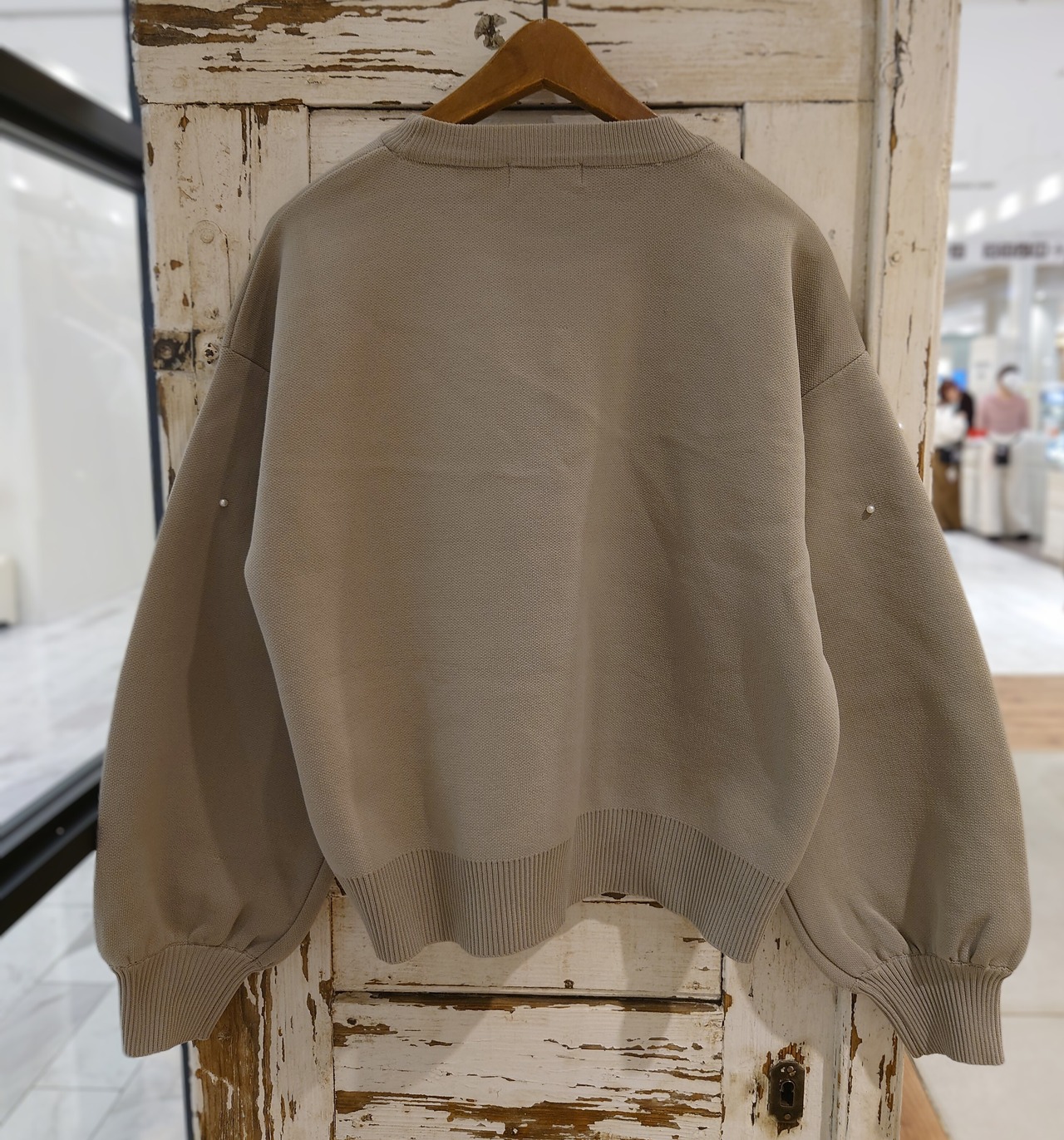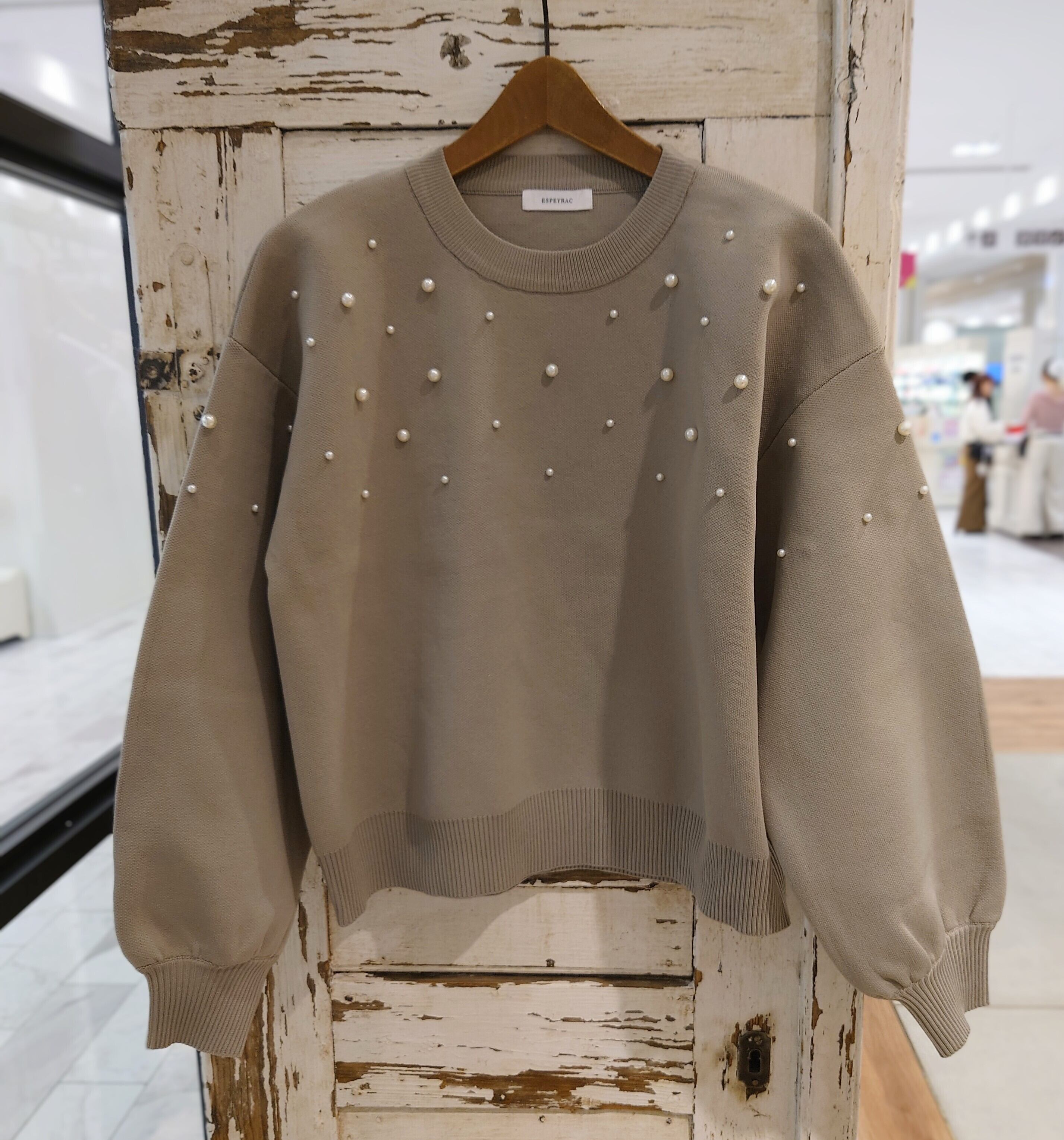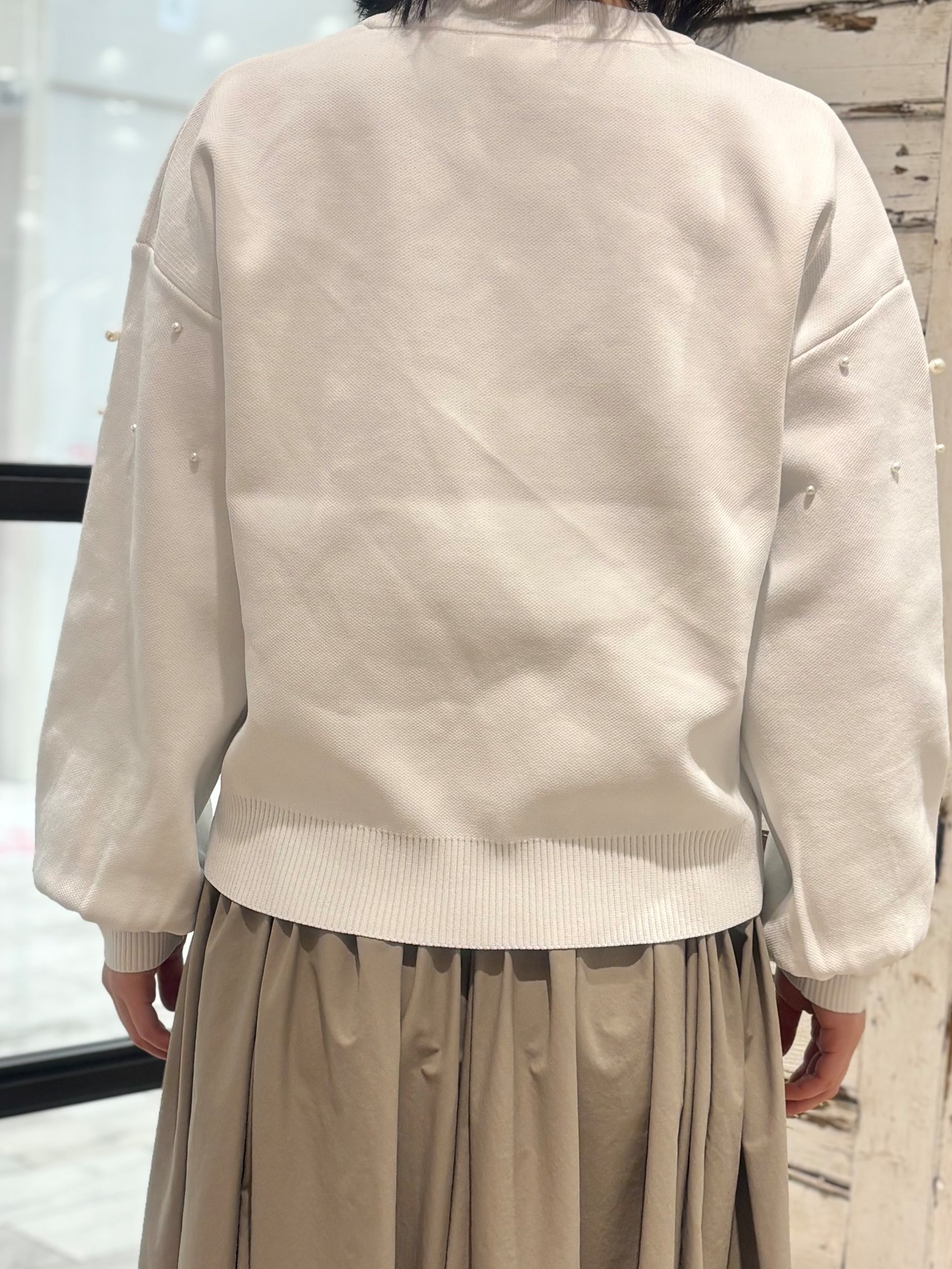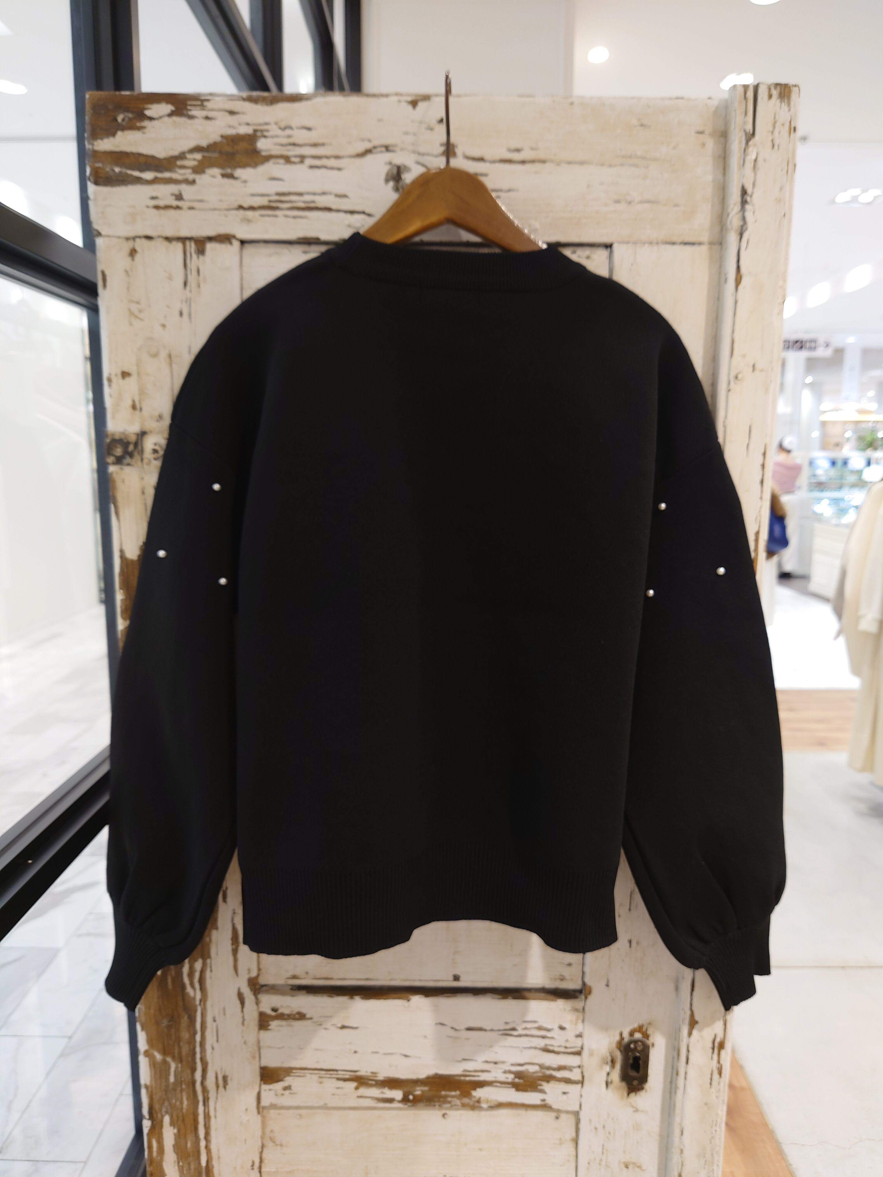 天竺ジャガード生地に光沢のある大小のパールが散りばめられたニット。