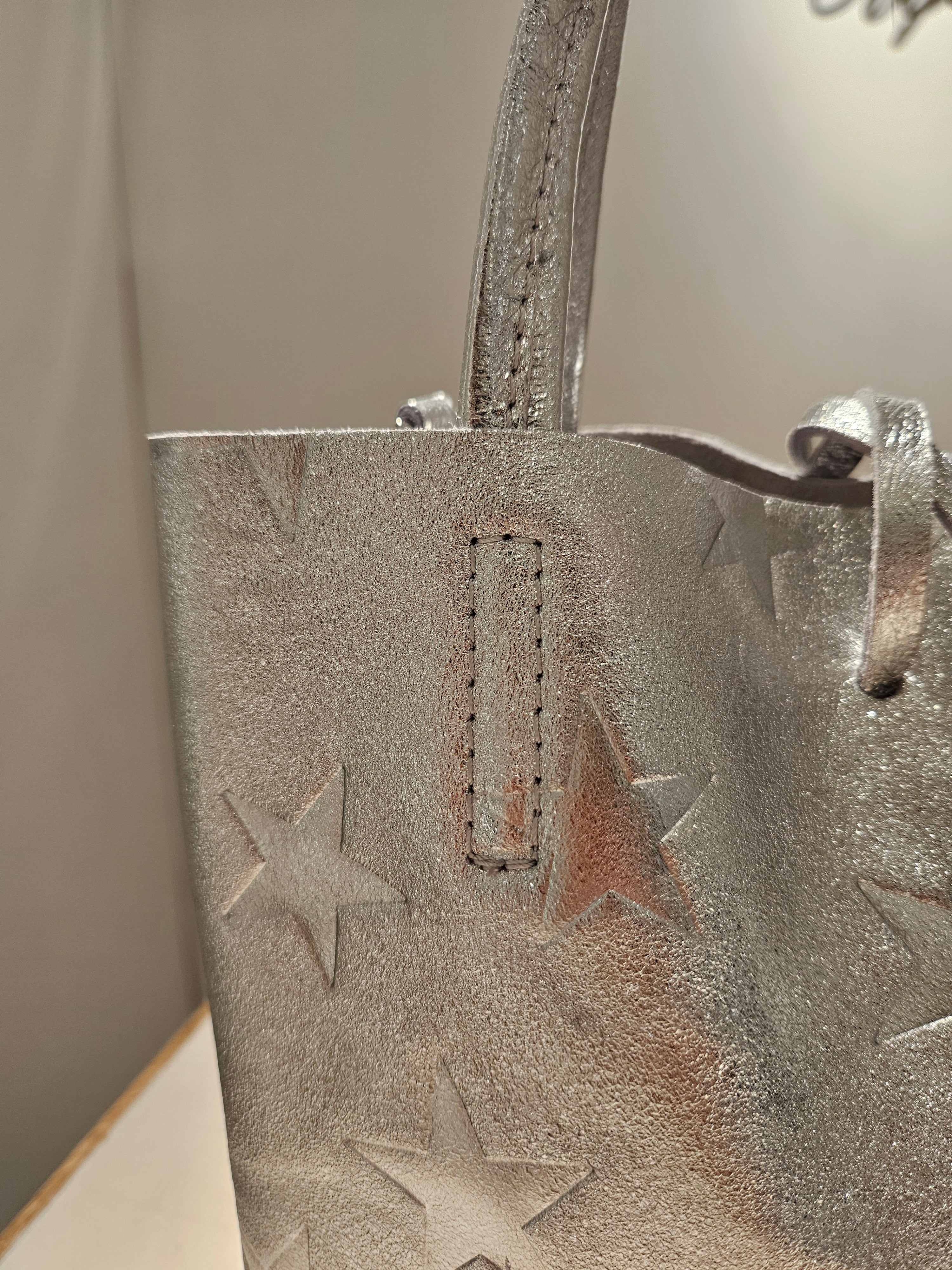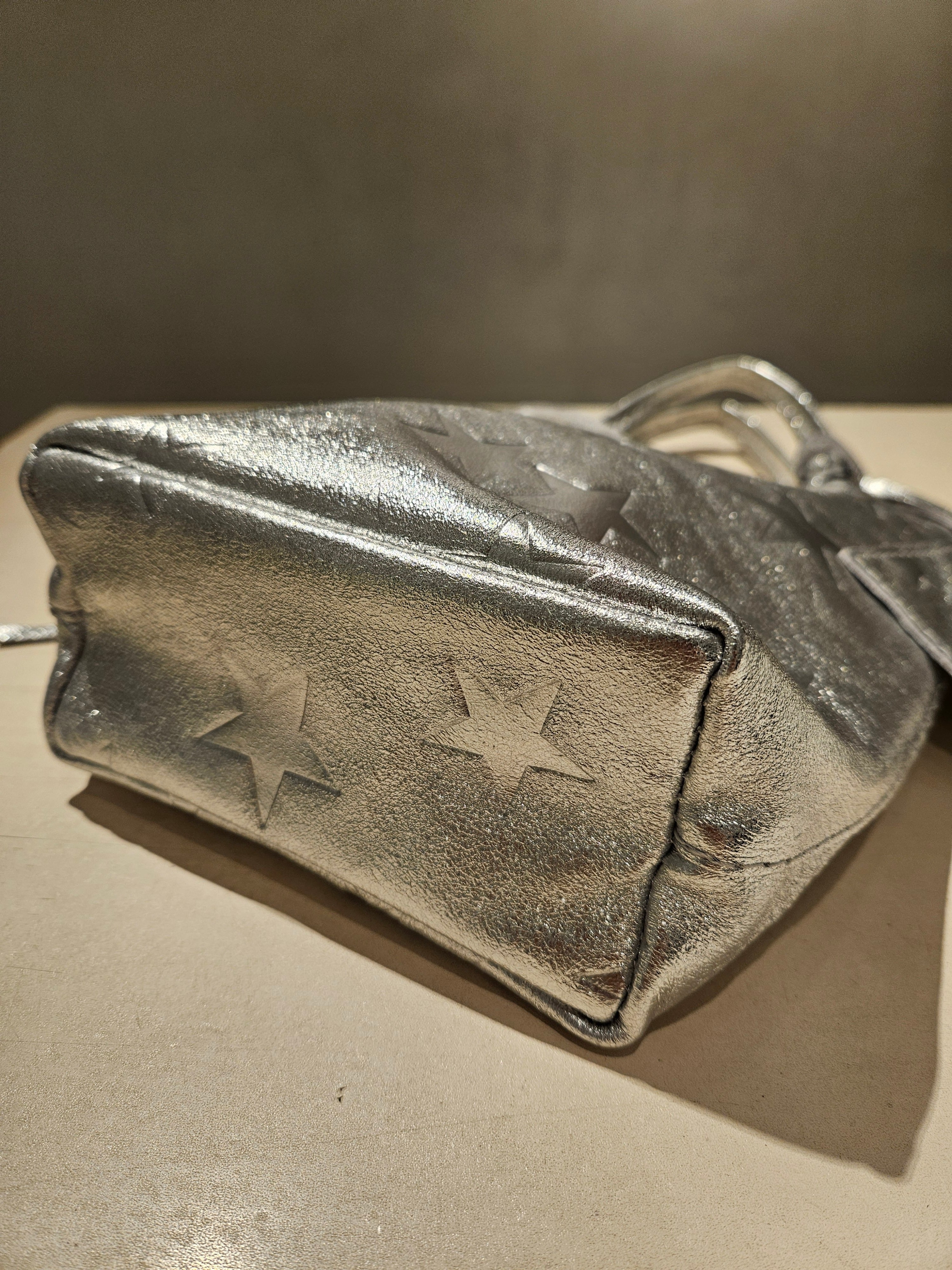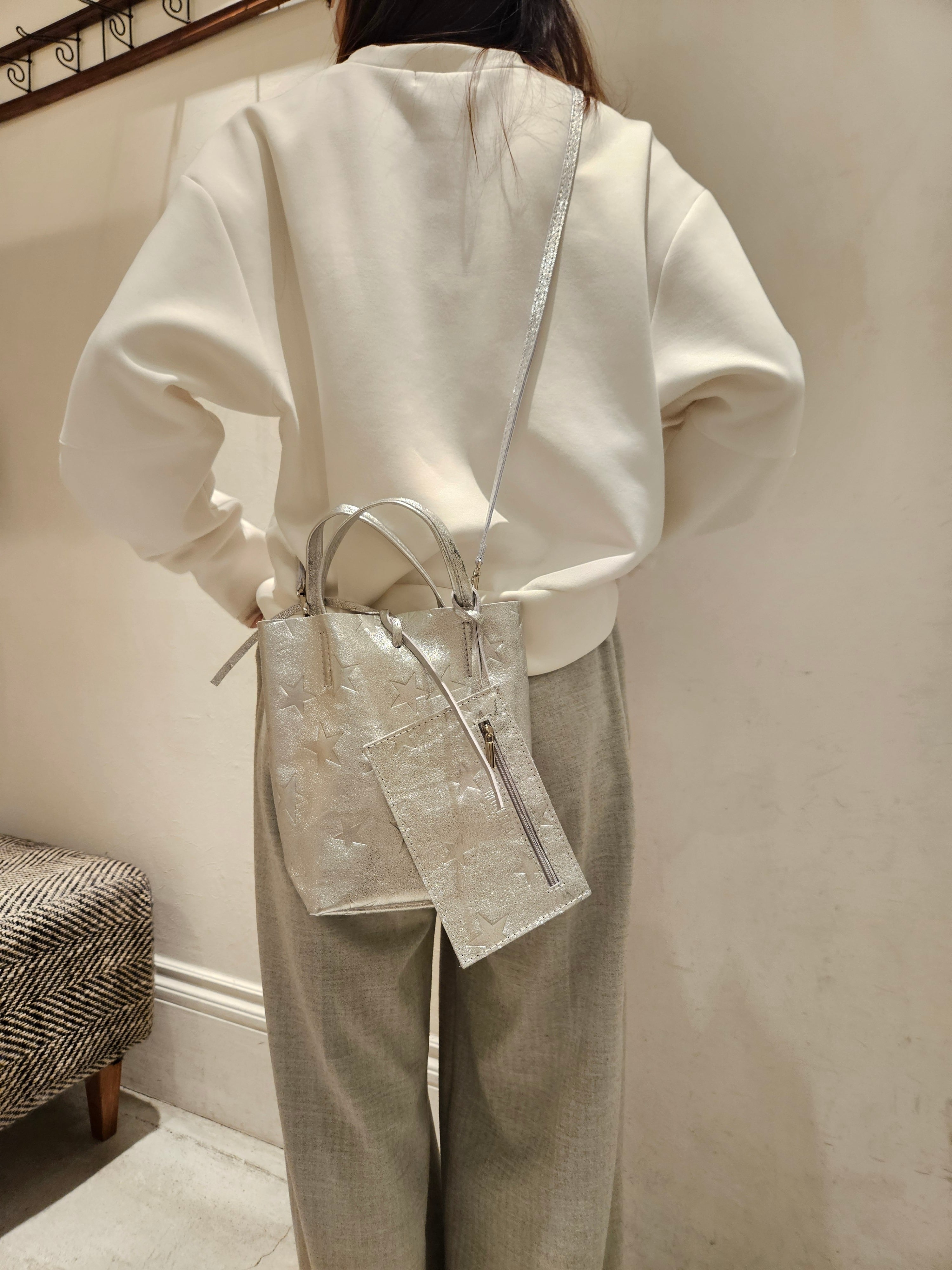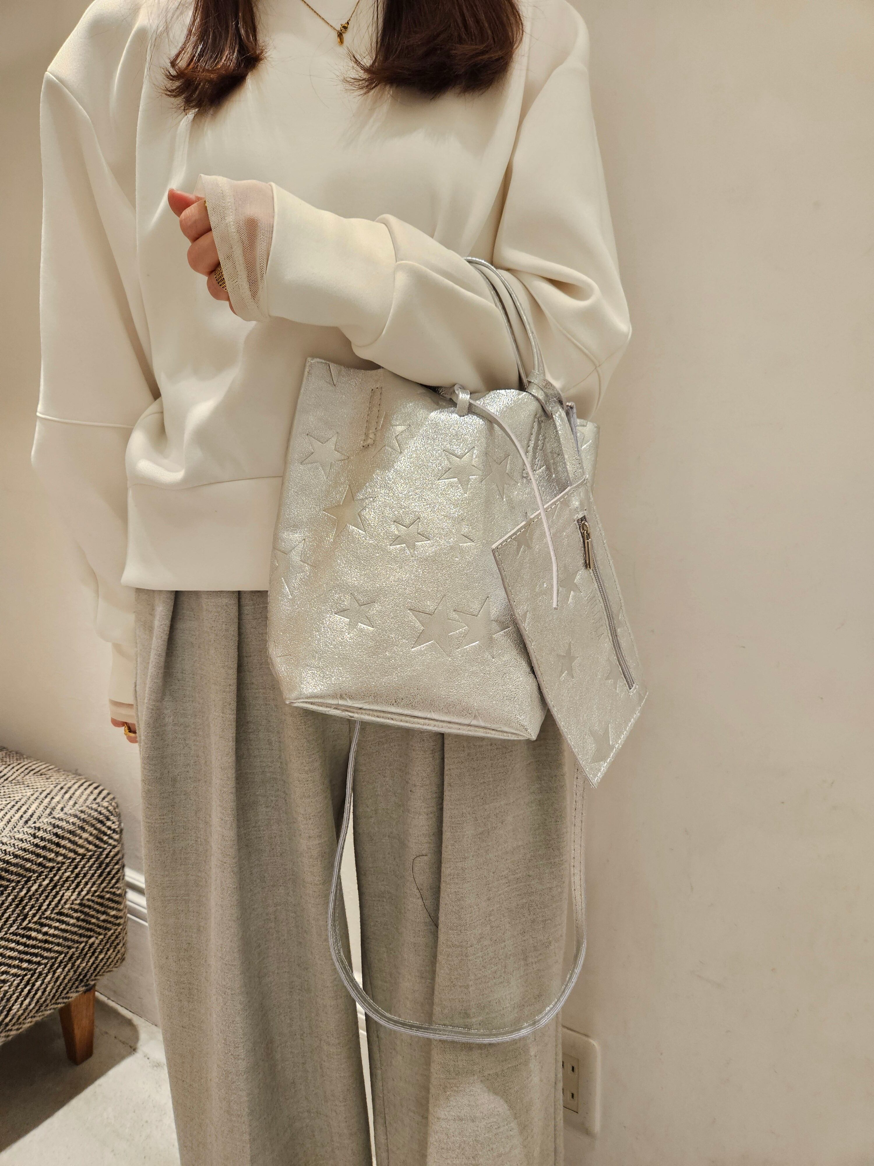 柔らかくリッチなメタリックレザーに、エンボス加工で星柄を表現したミニトートバッグ。