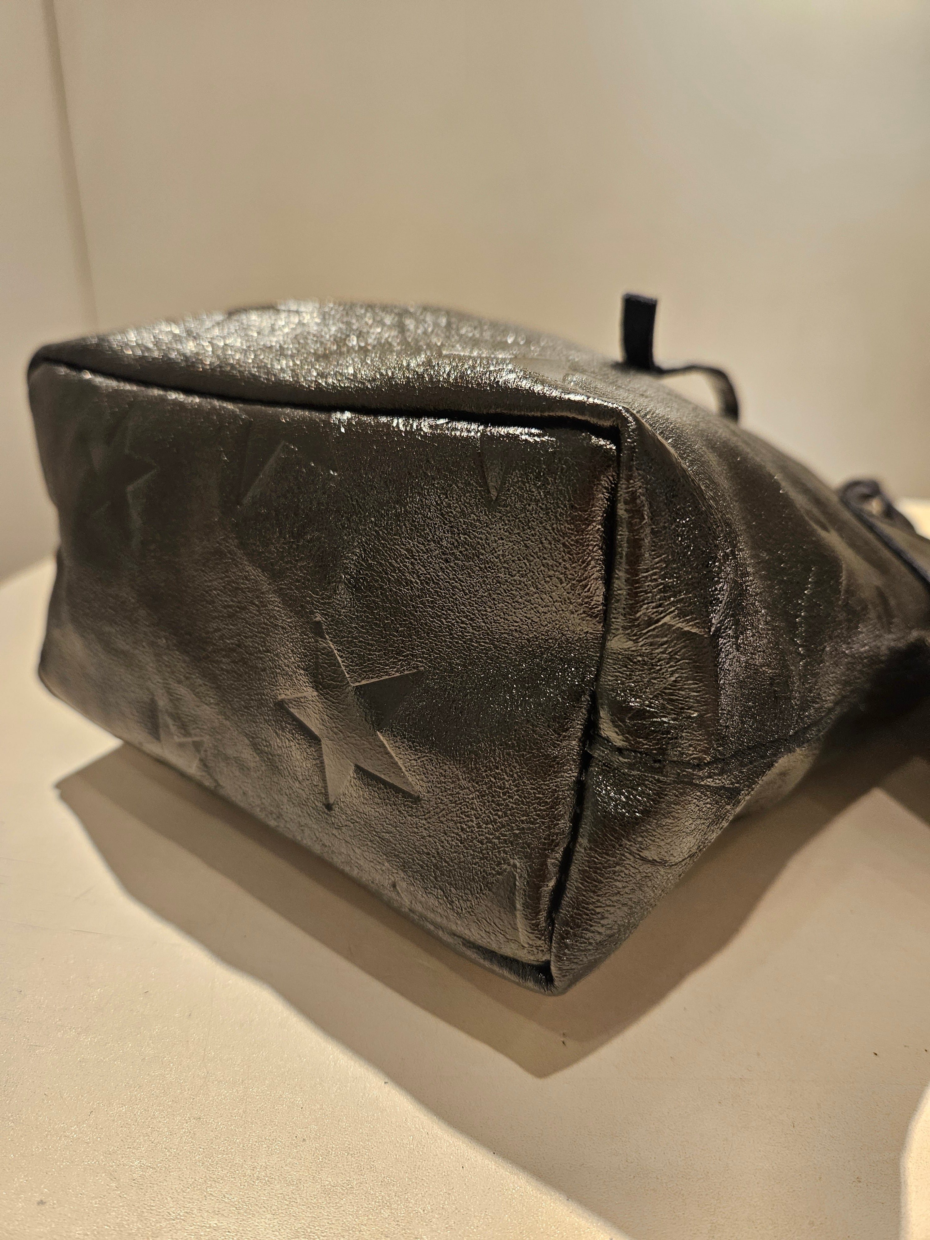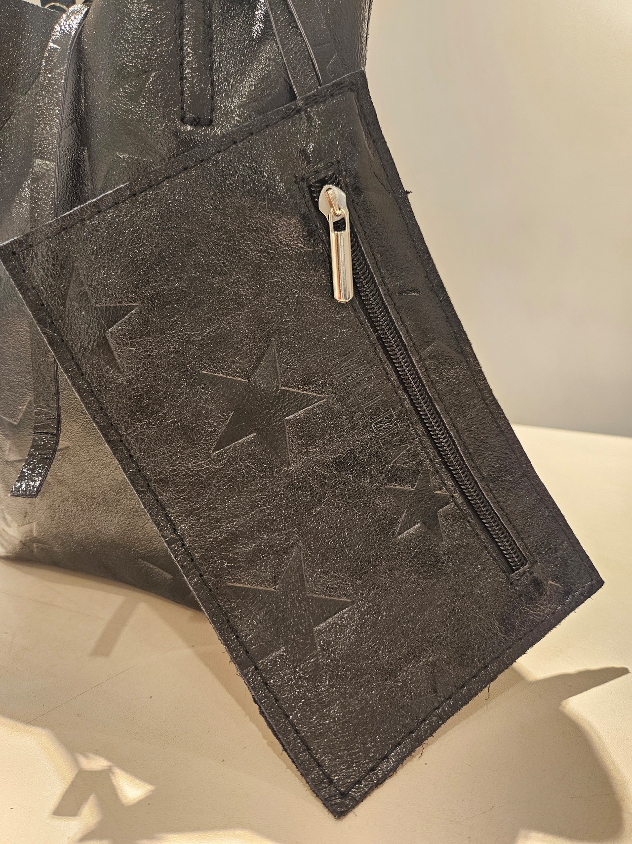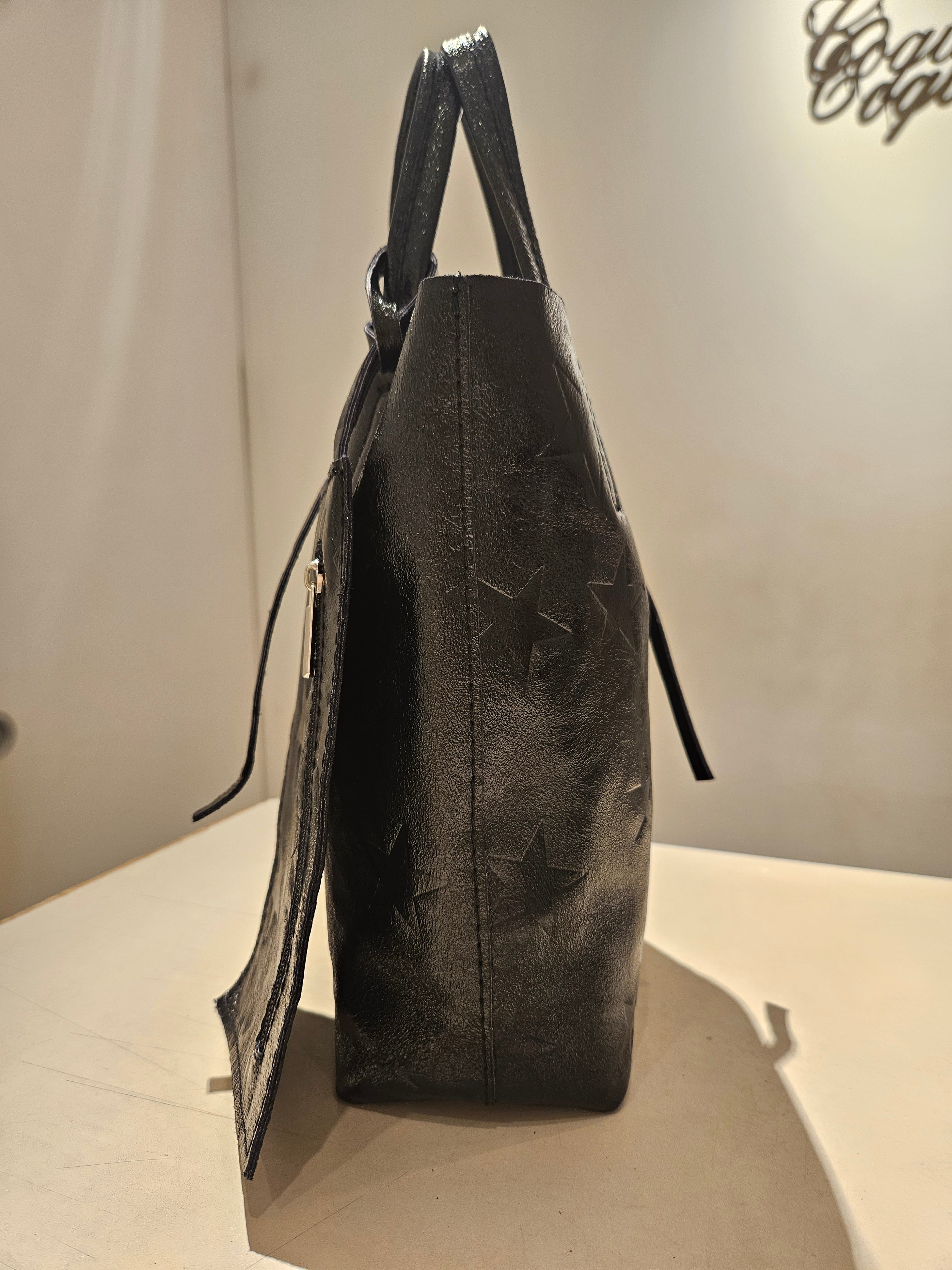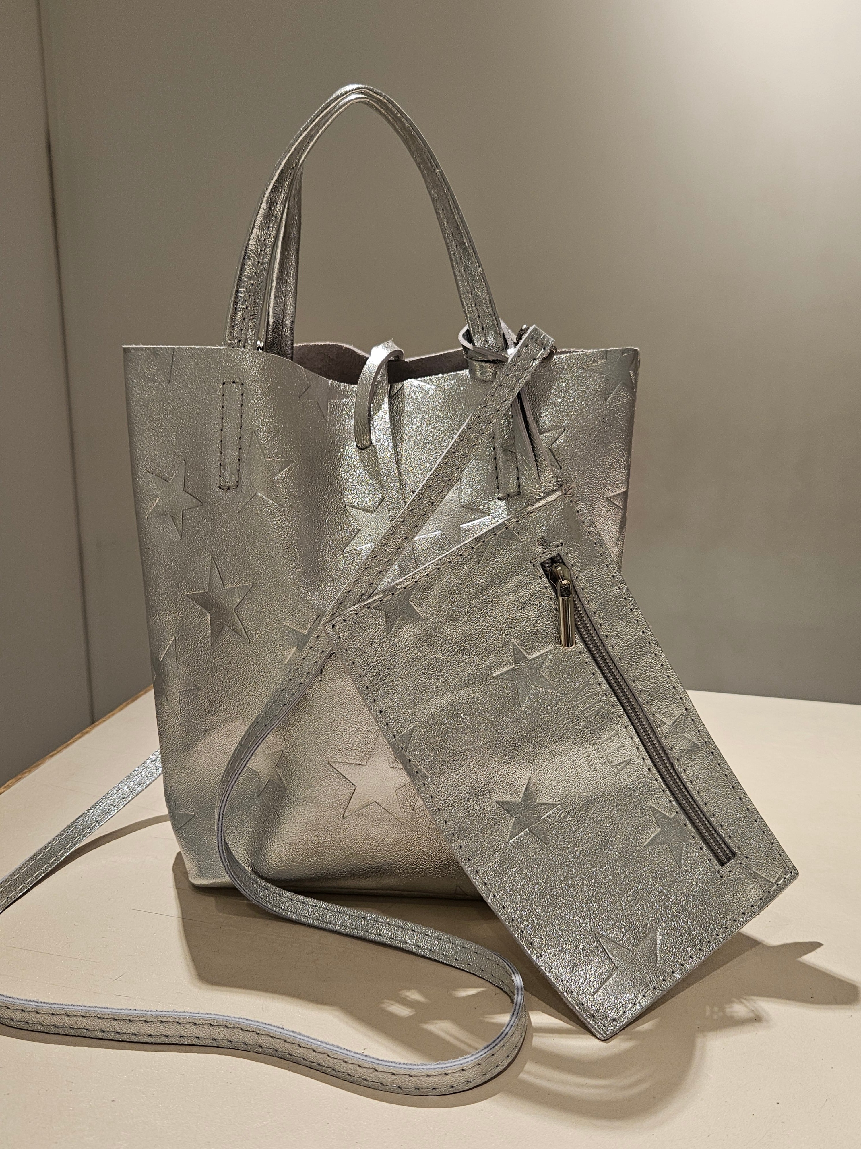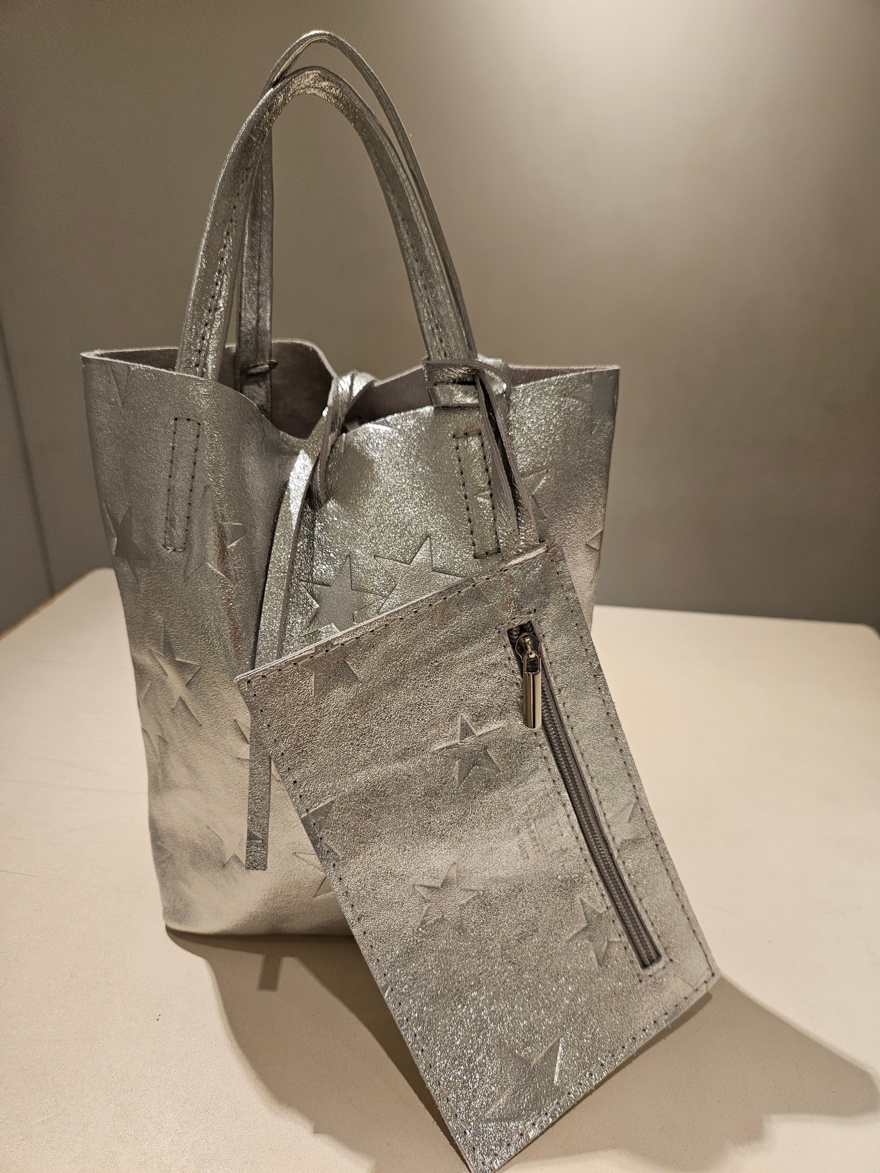 柔らかくリッチなメタリックレザーに、エンボス加工で星柄を表現したミニトートバッグ。