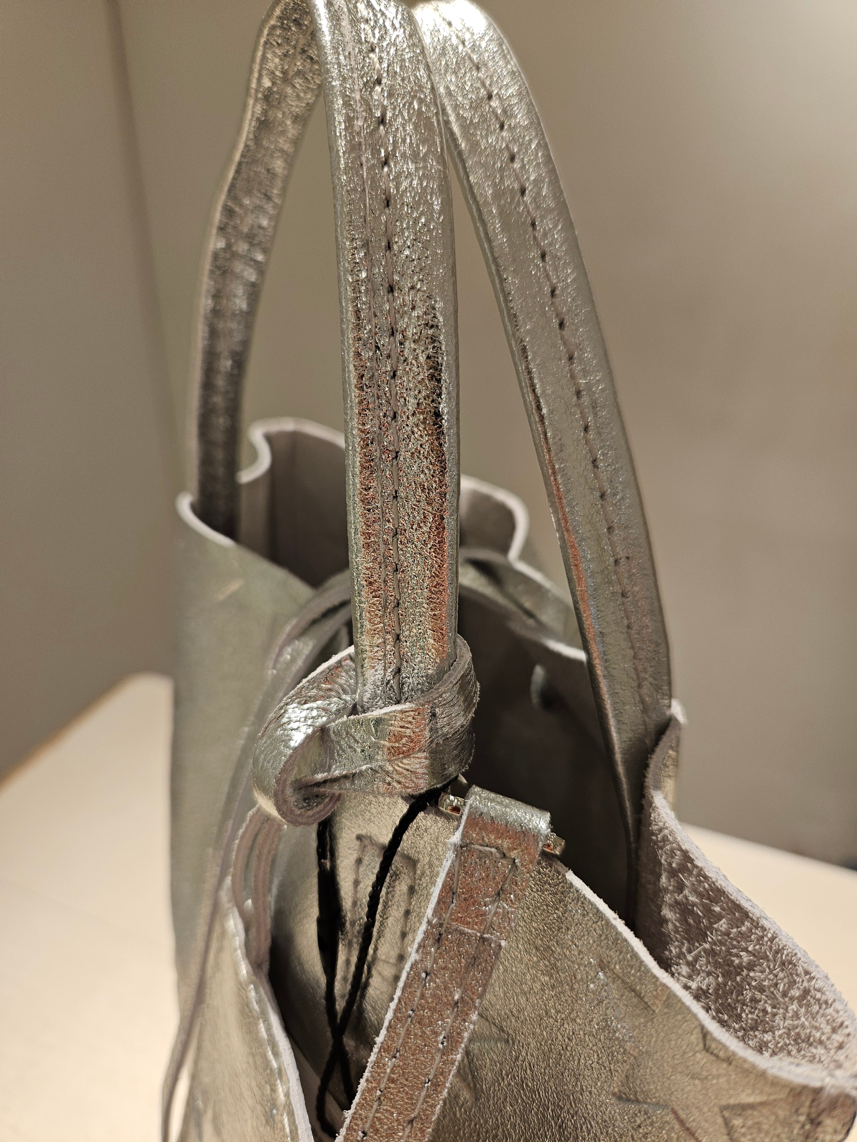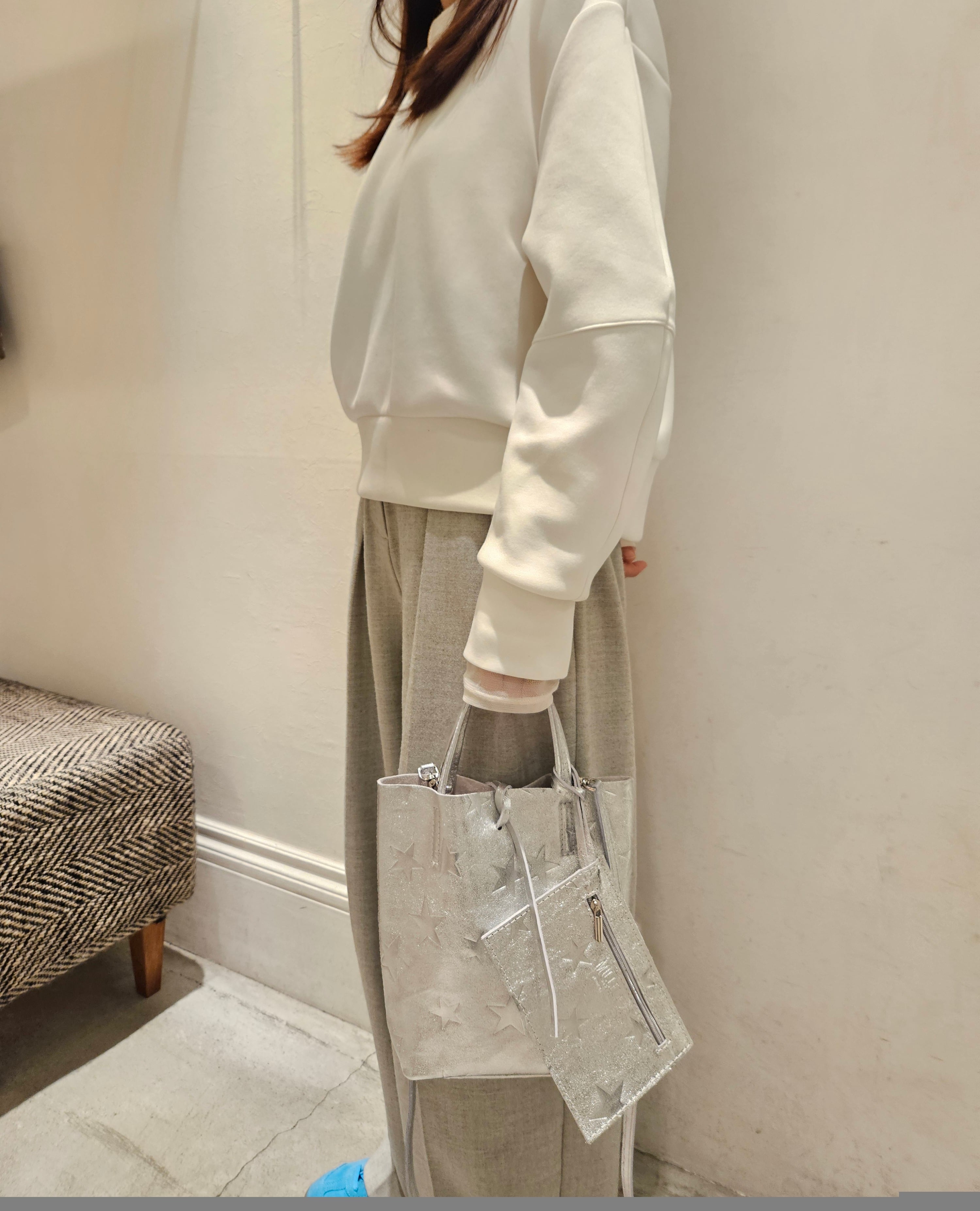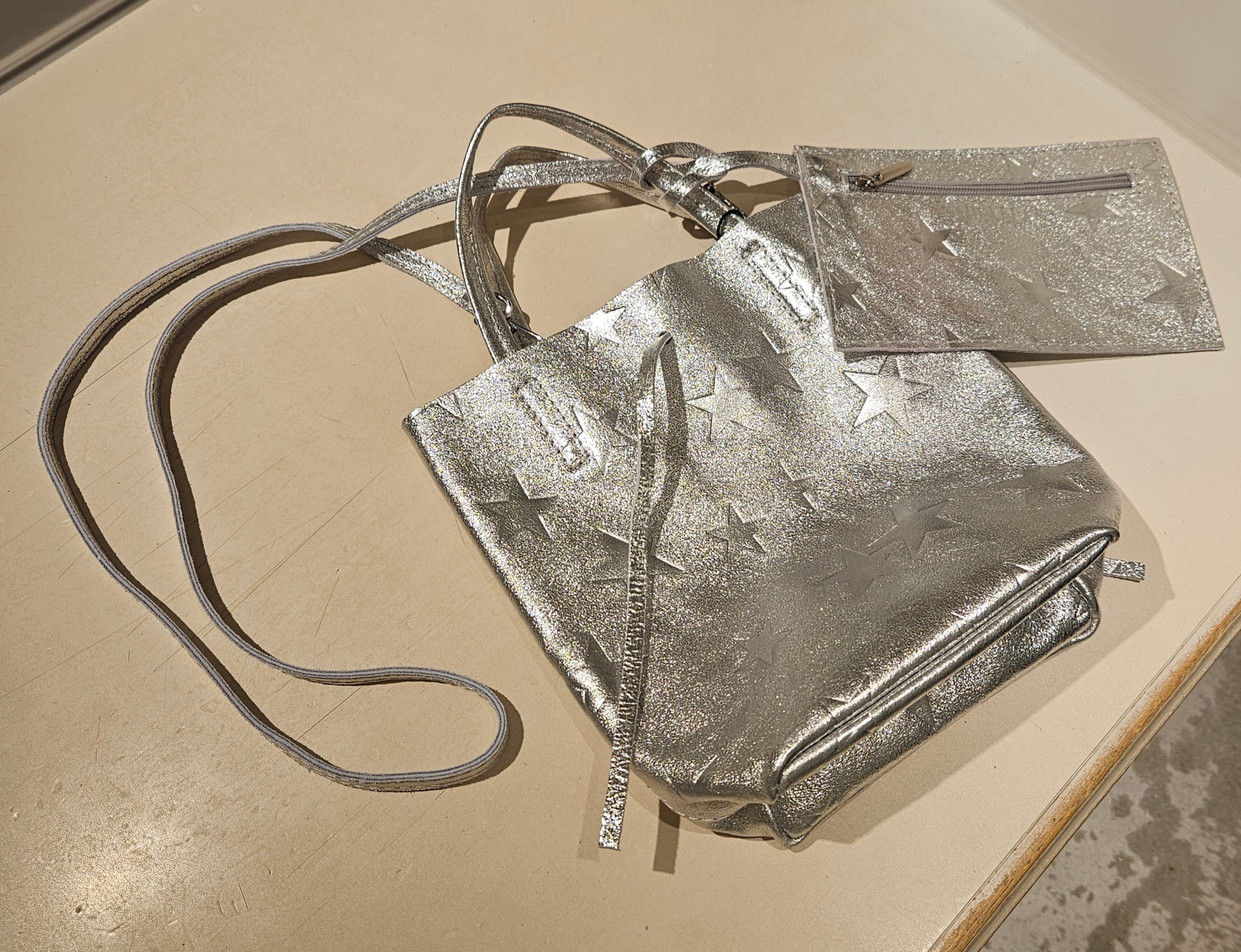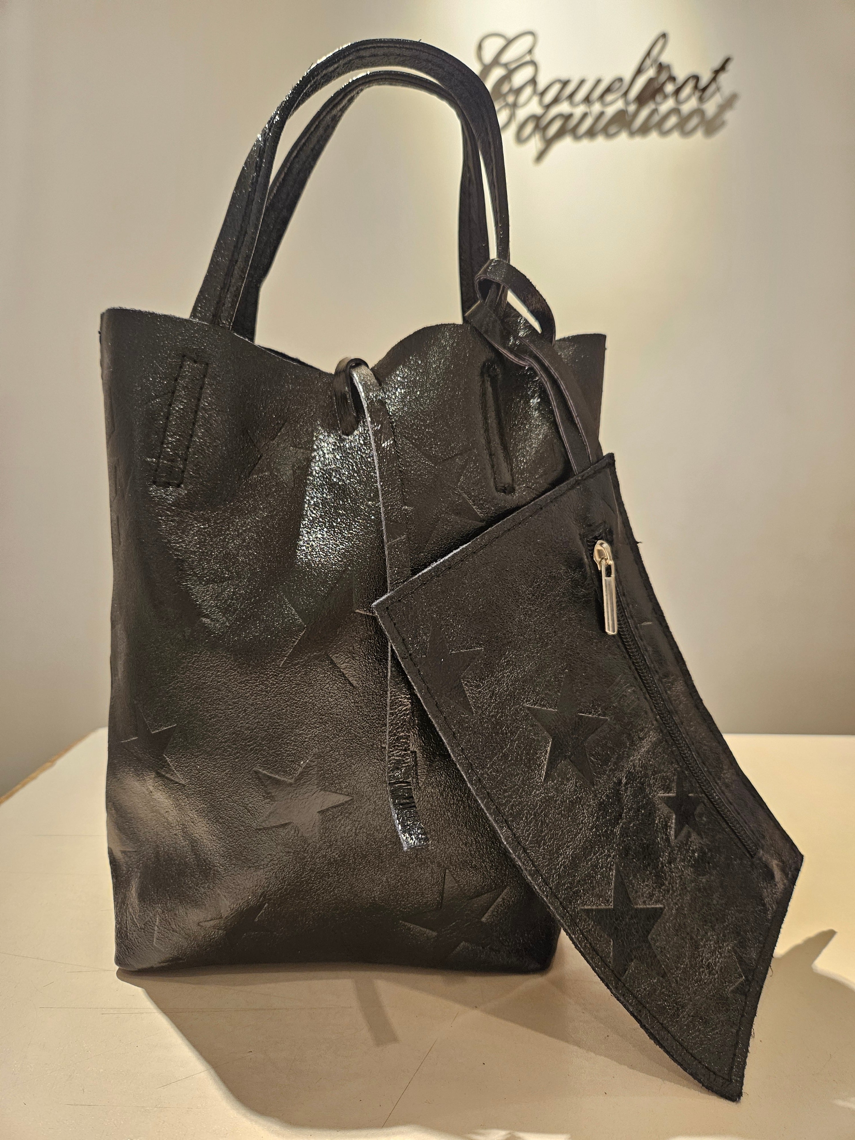 柔らかくリッチなメタリックレザーに、エンボス加工で星柄を表現したミニトートバッグ。