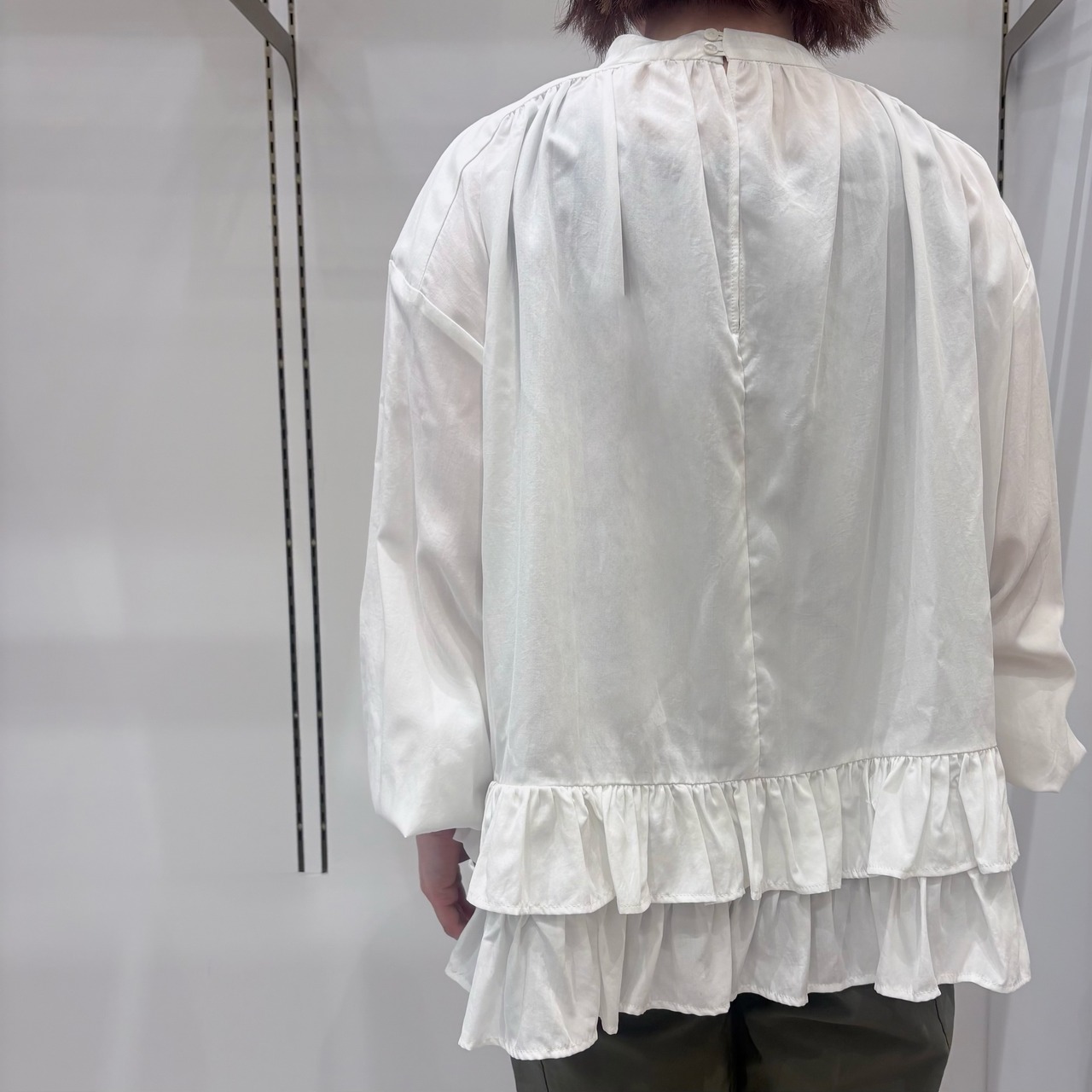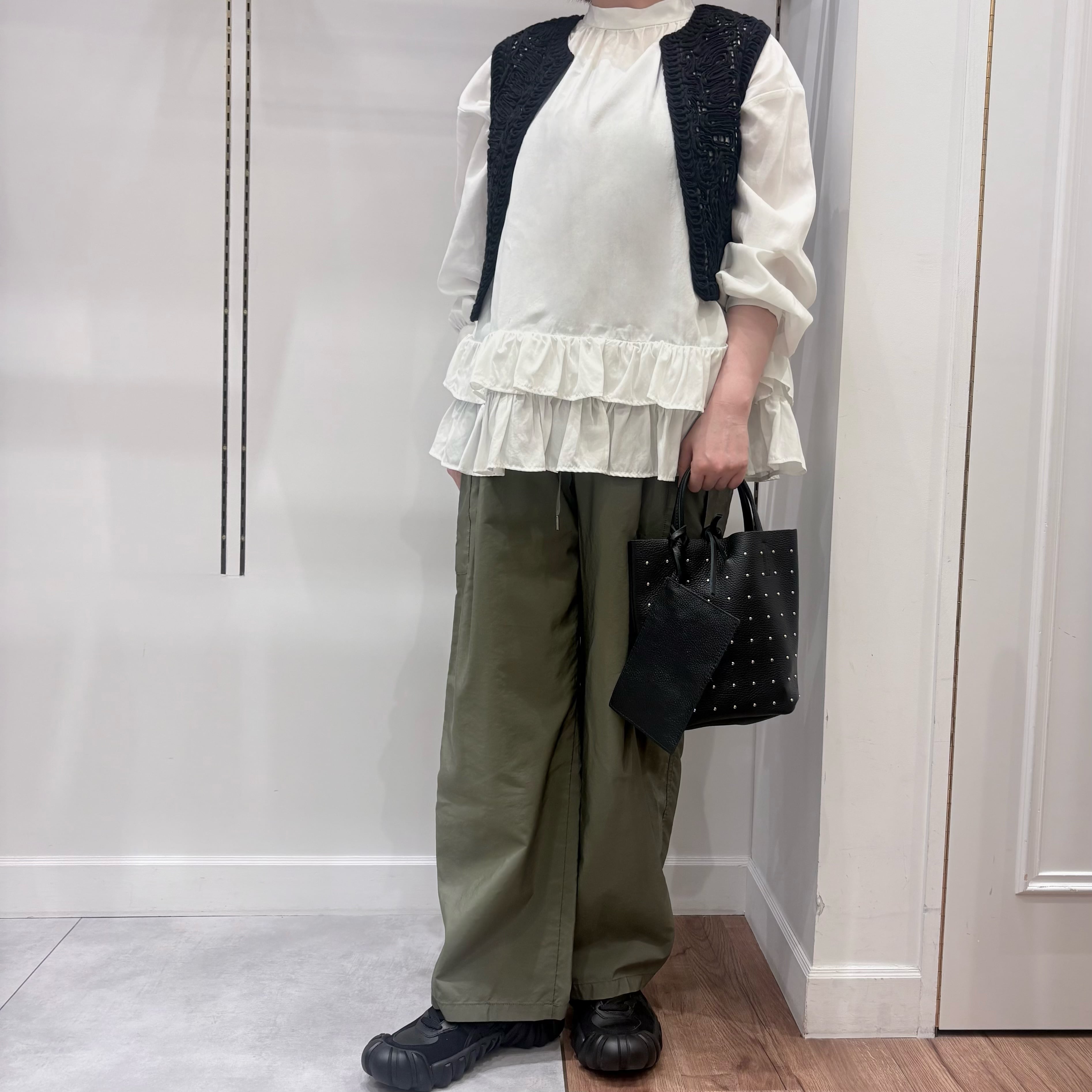 ニットやプルオーバーとレイヤードして着てもかわいい、裾のフリルディティールがポイント。