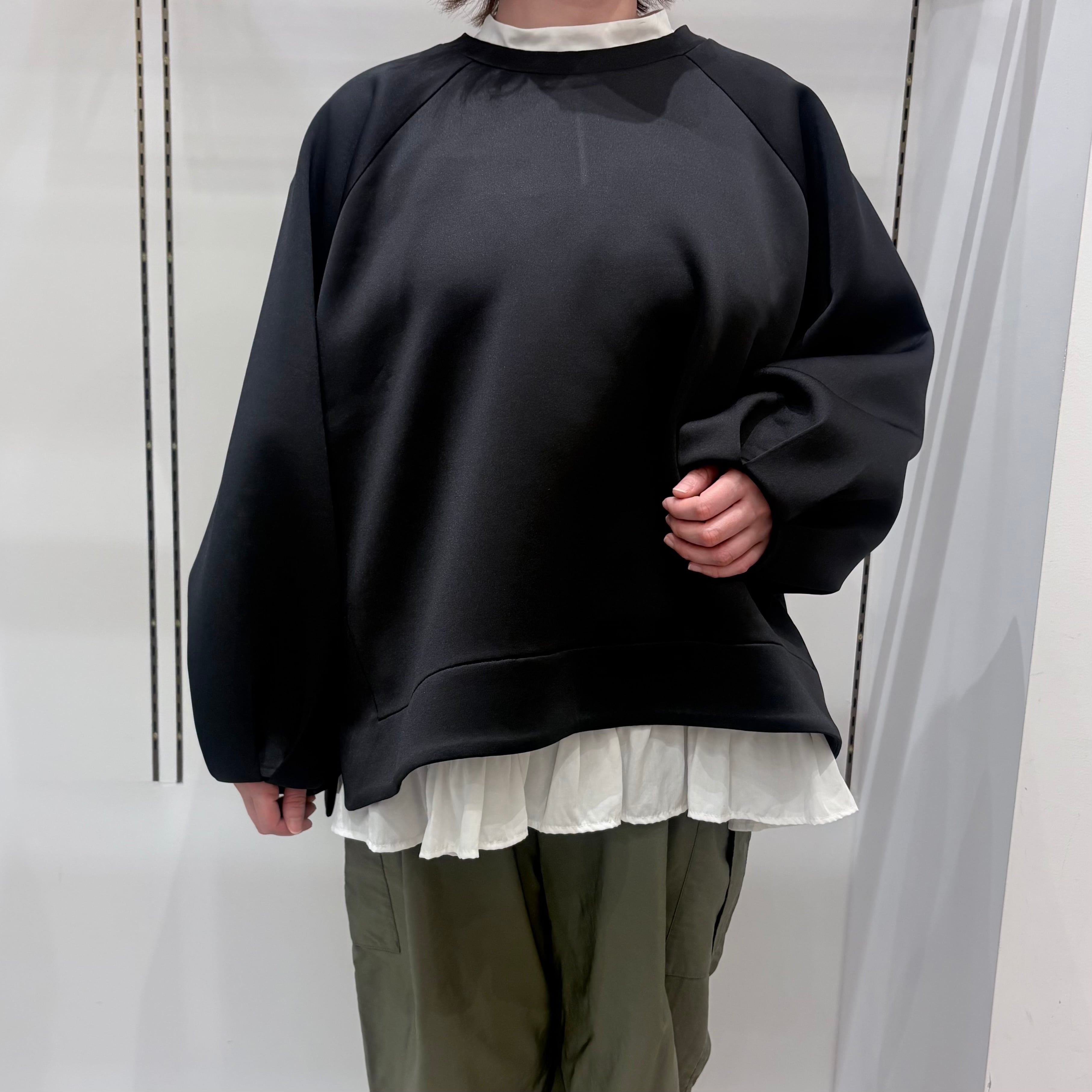 肌寒い時はプルオーバーとのレイヤードがおすすめ。