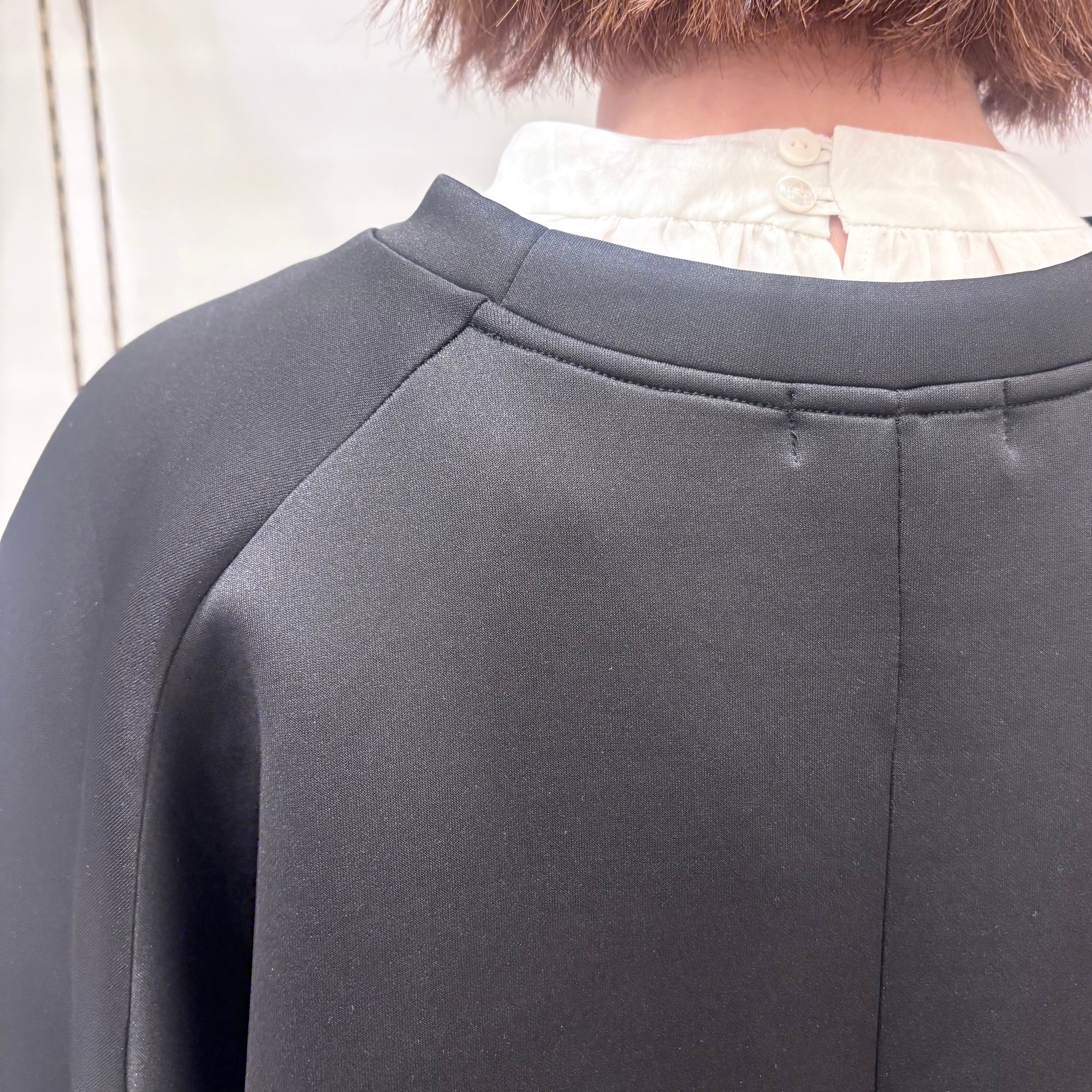 首元の後ろボタンはシェルボタンでさり気ないワンポイントになっていています。