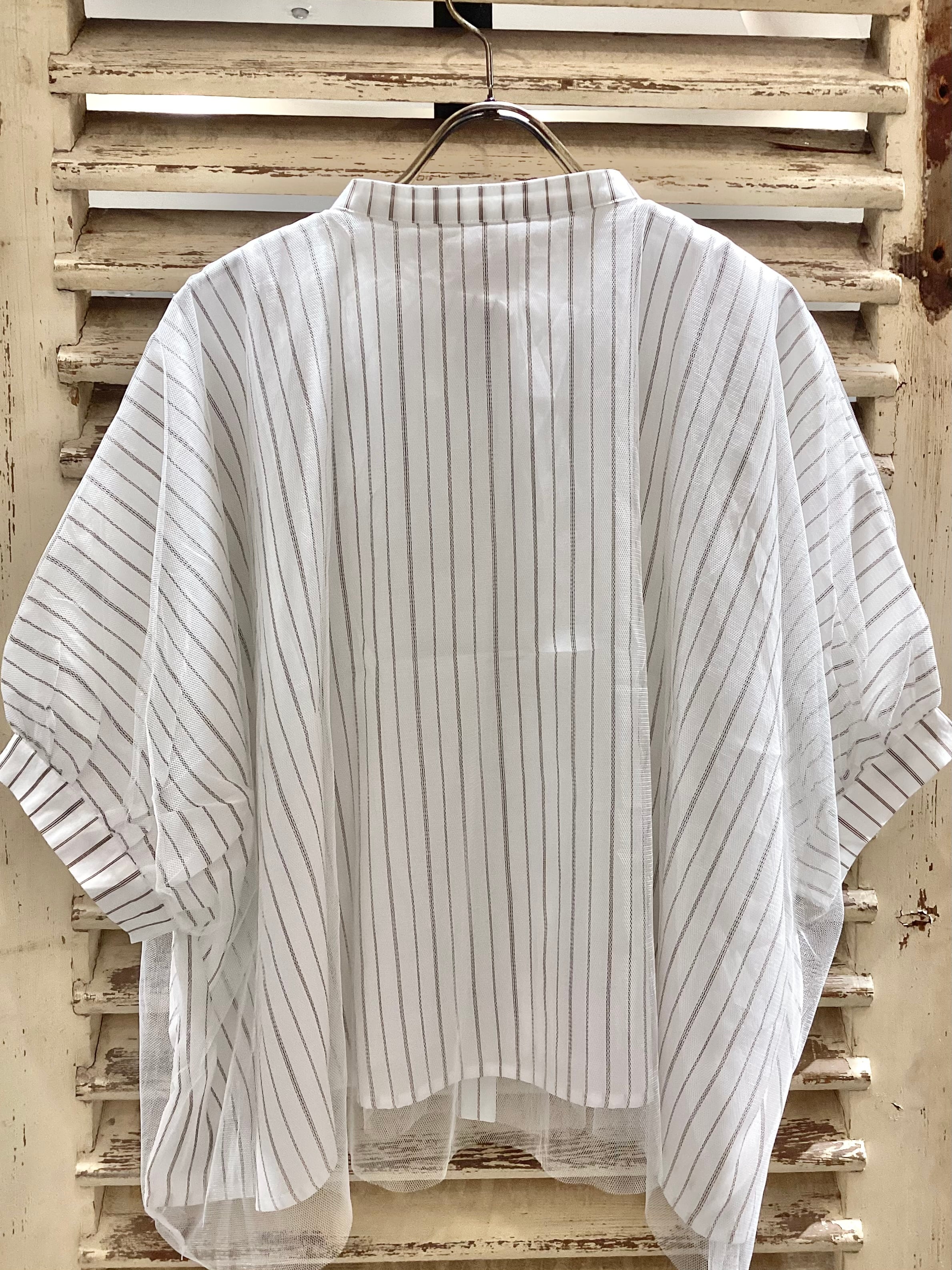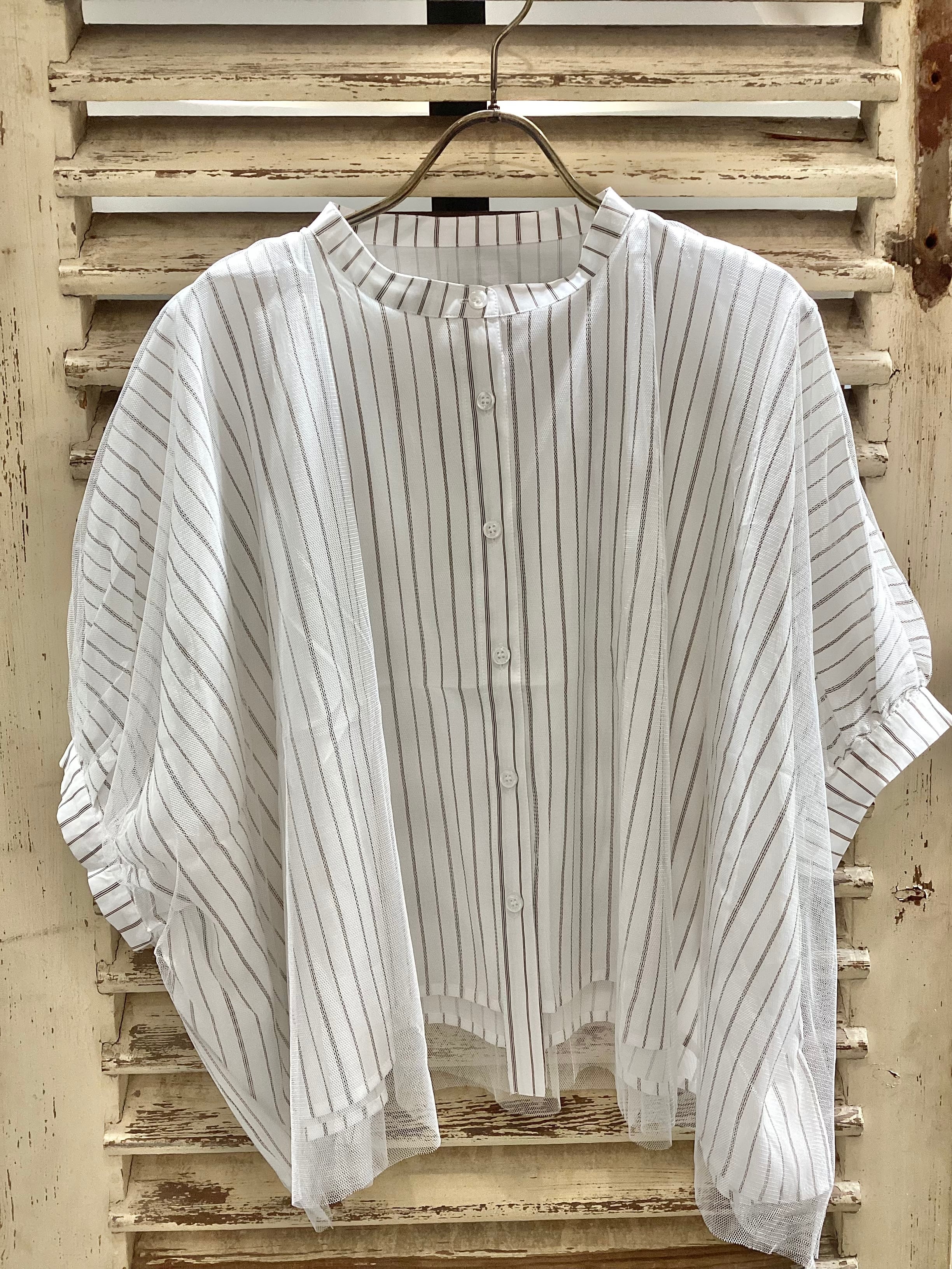 ブラウンのストライプの上からチュール生地をプラスしたクロップド丈のシャツブラウス。