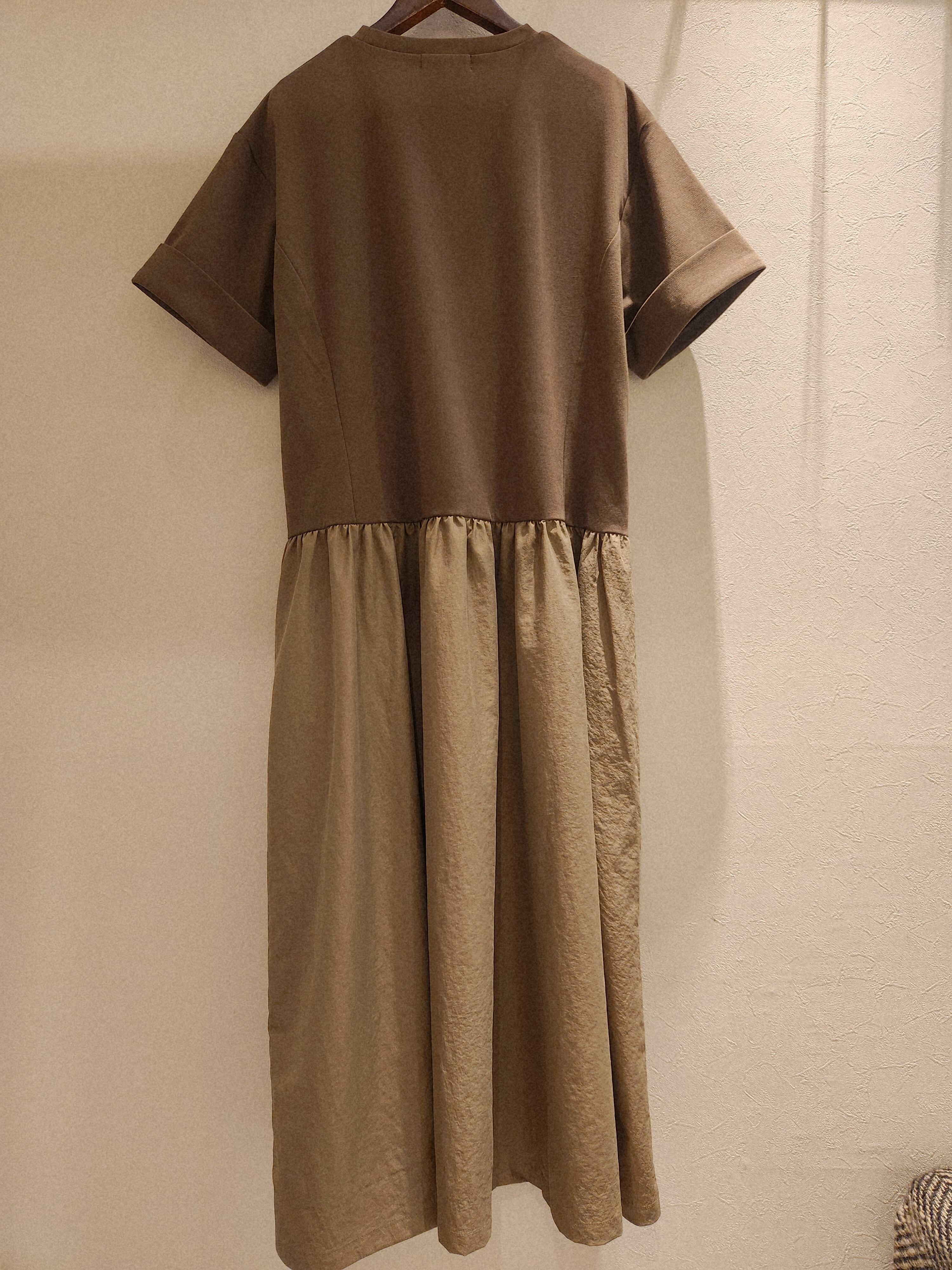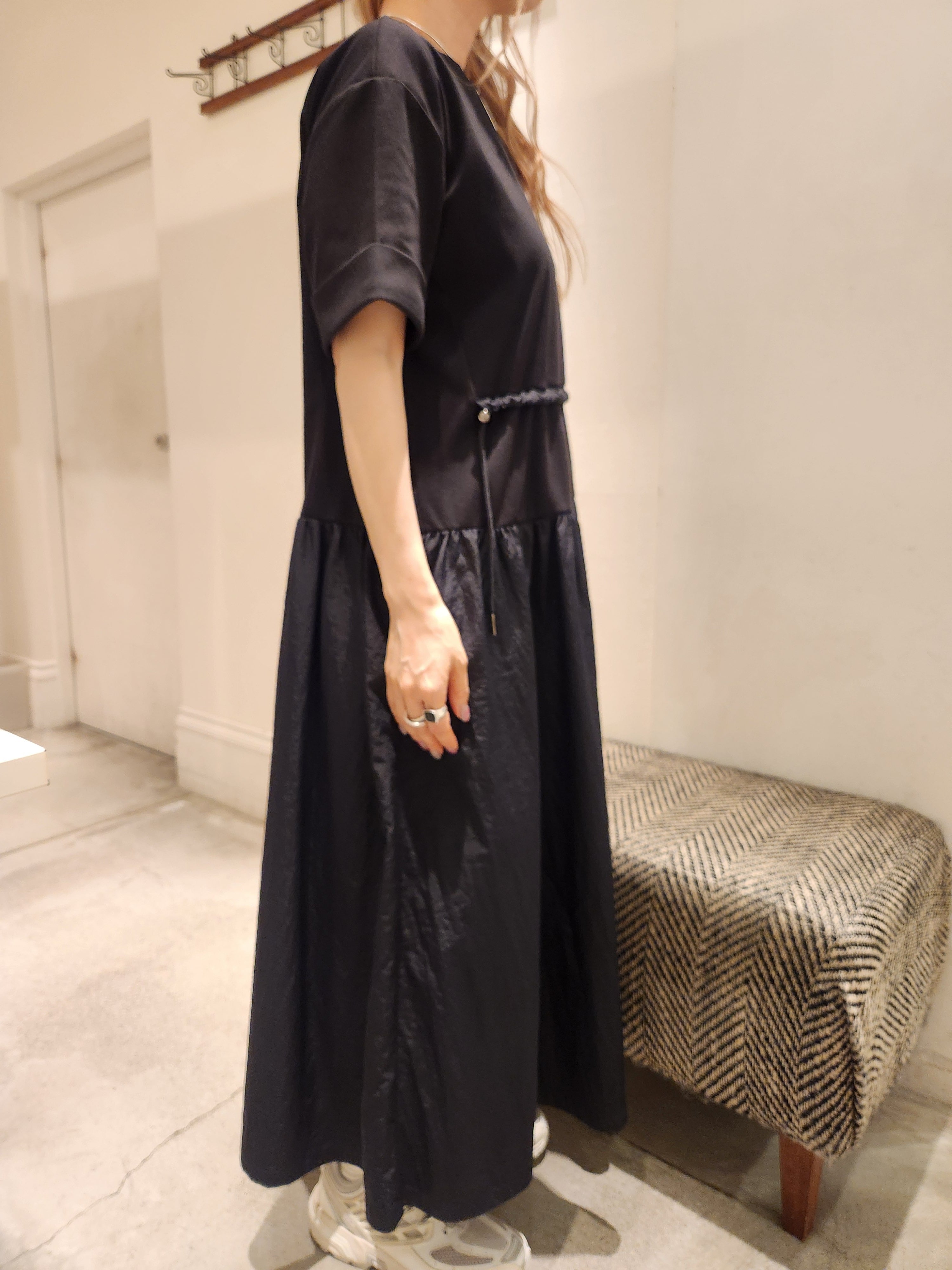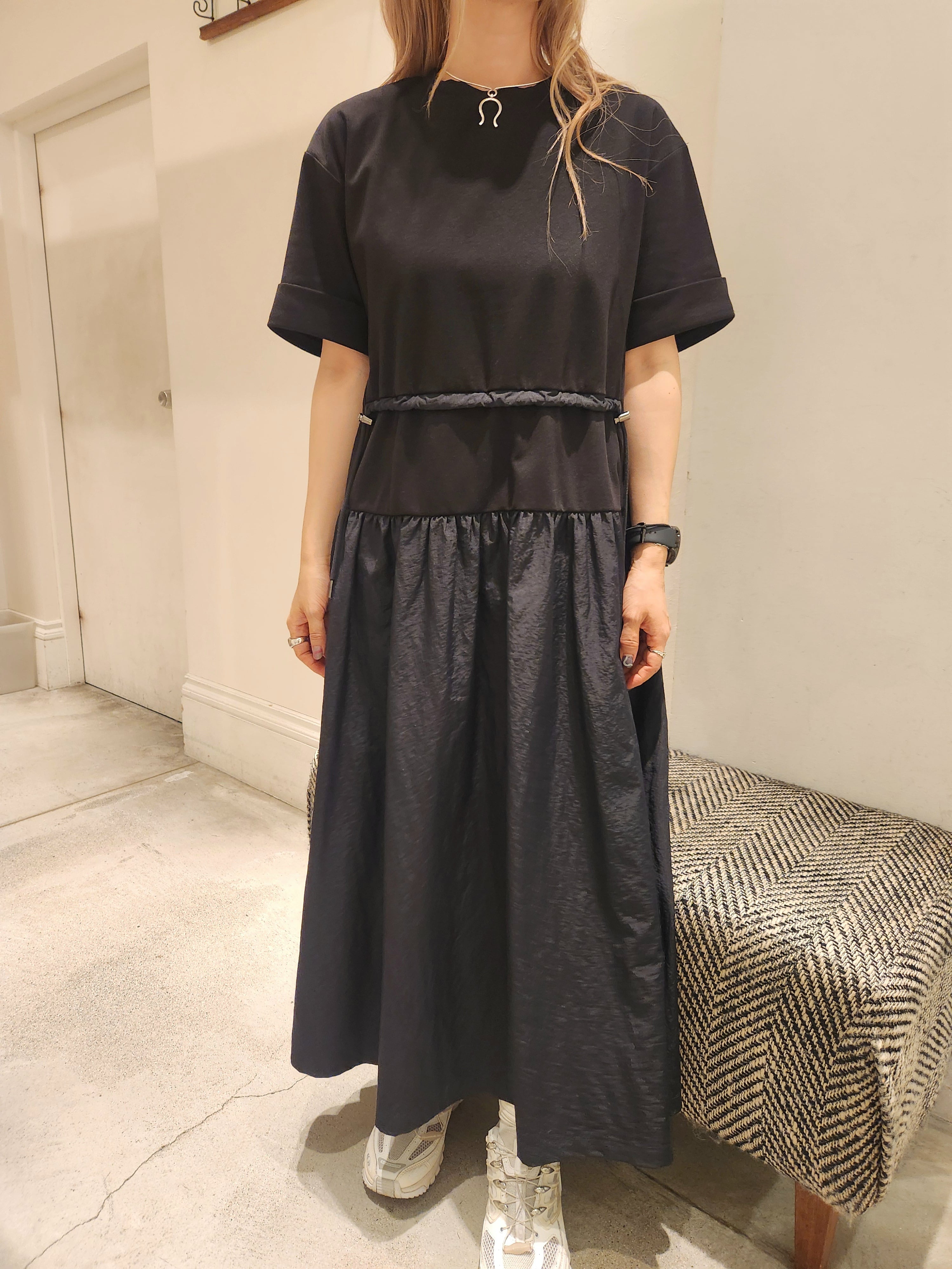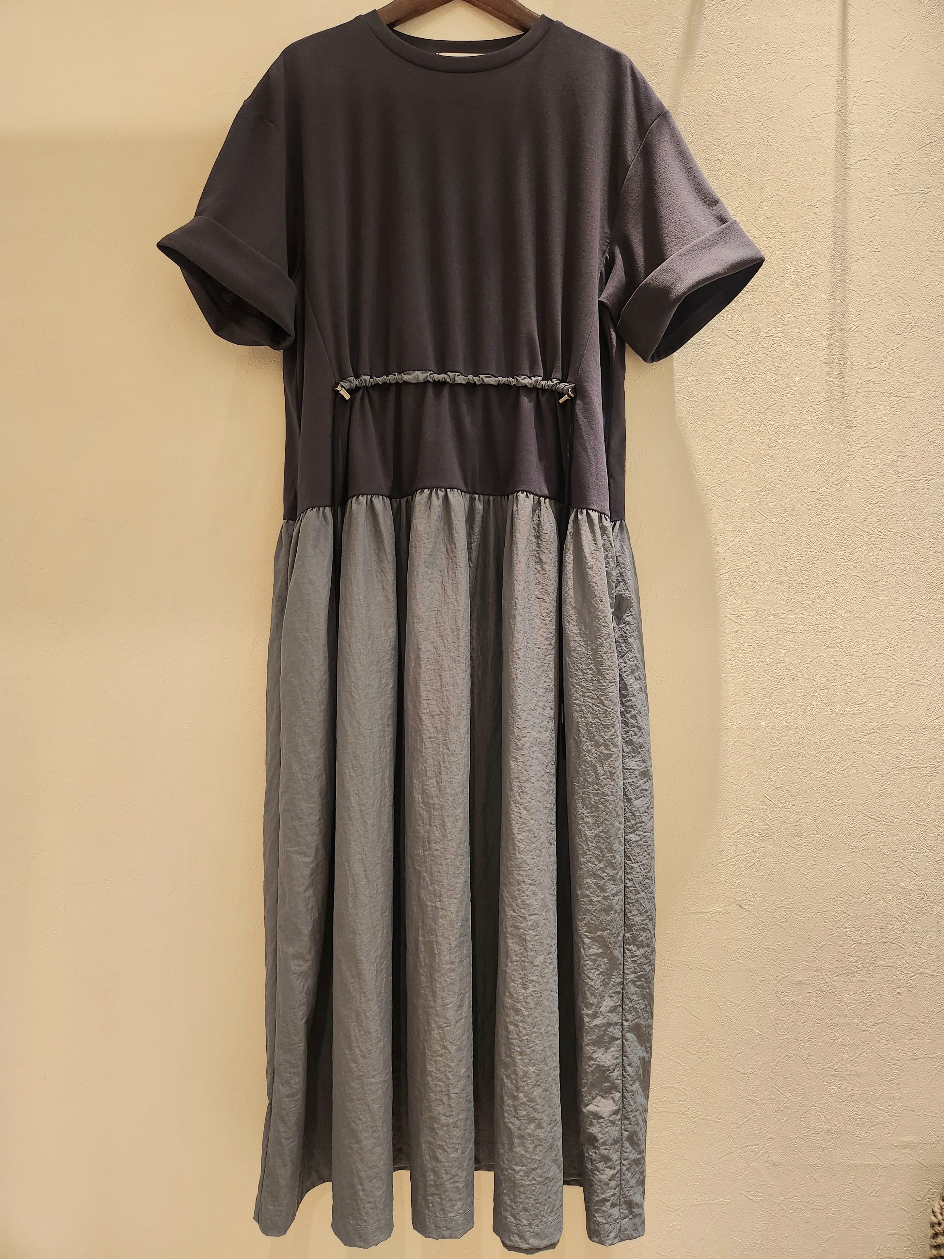 カットソーと布帛をドッキングしたワンピース。